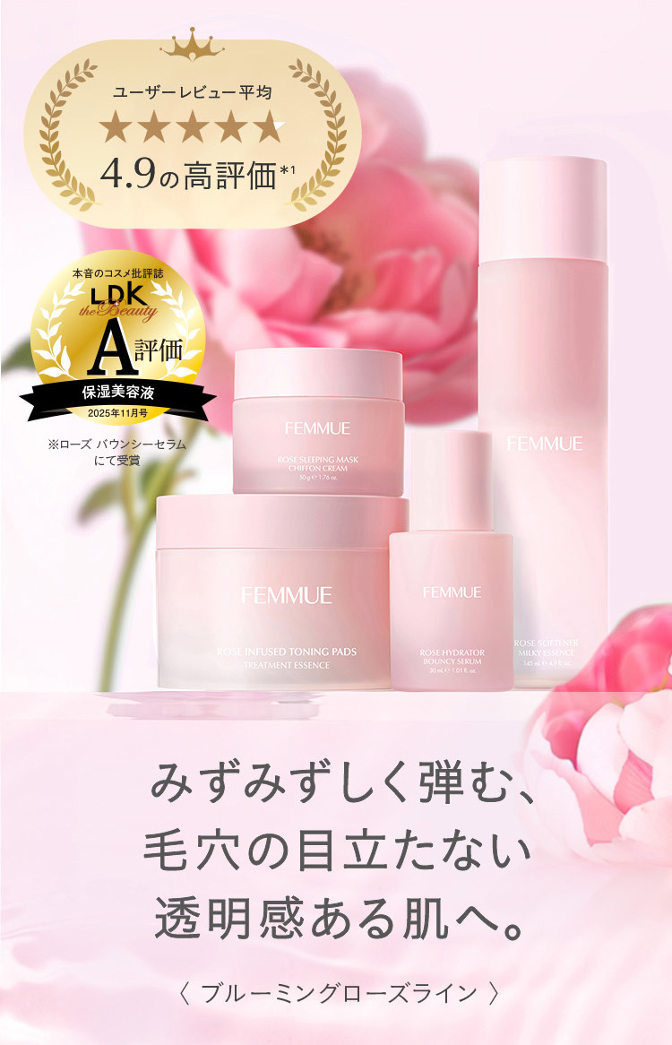 *2 DNA-Na/ハリ成分 *3 ハリ・ツヤ成分 *4 ローズインフューズド トーニングパッドを除く