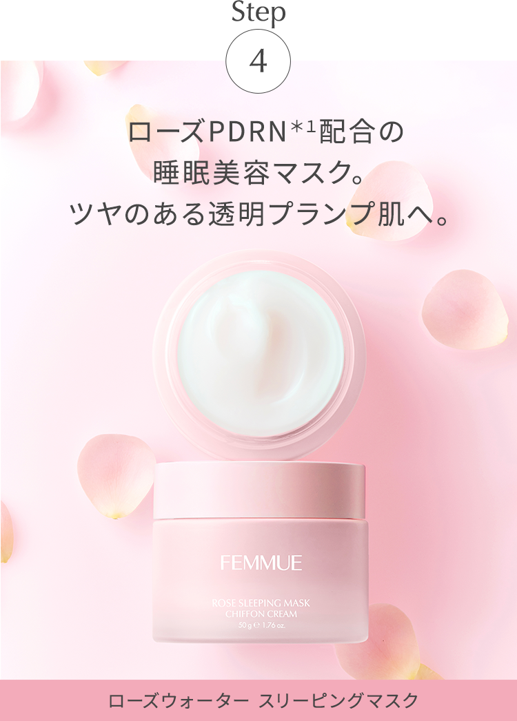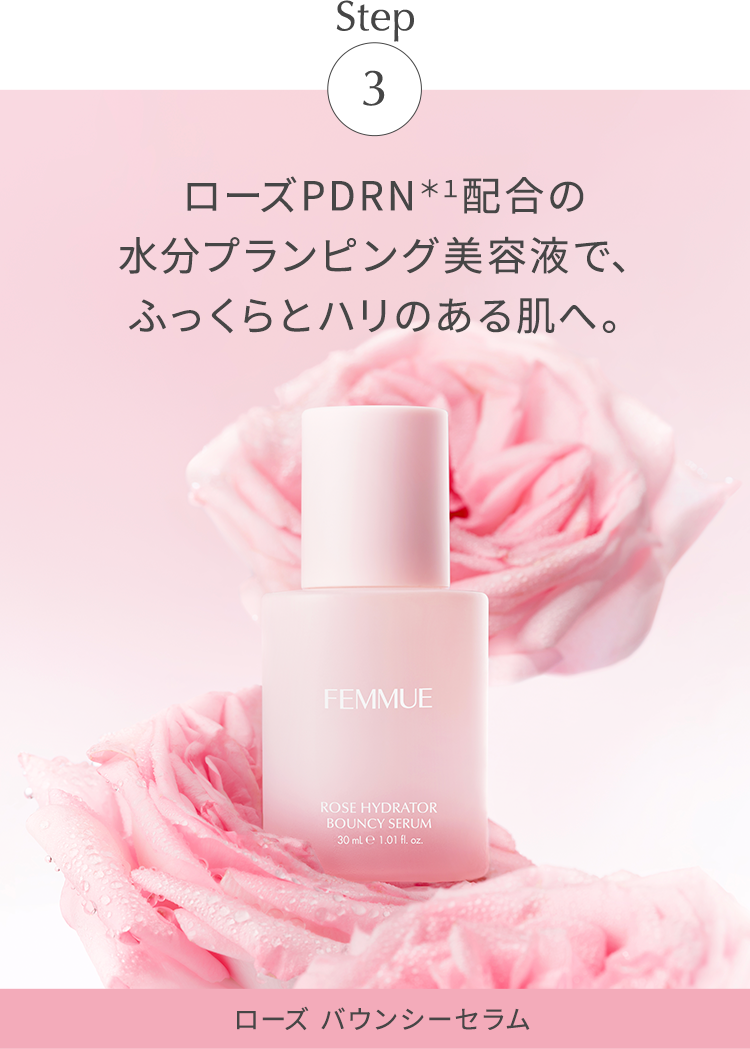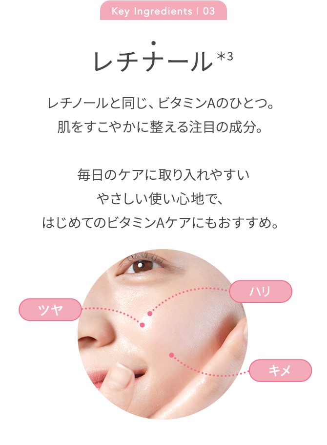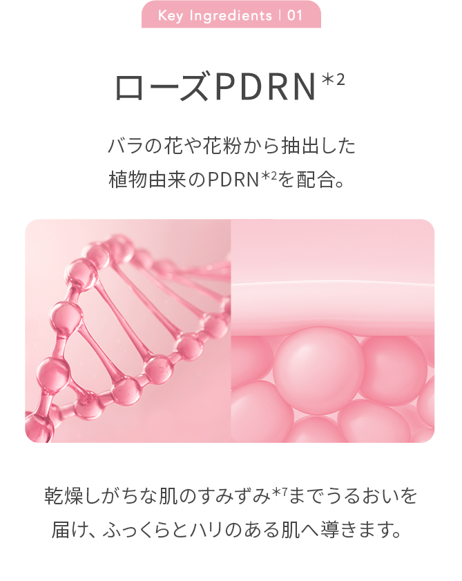 ダマスクローズウォーター*2をベースに、ローズPDRN*1、8種のヒアルロン酸*3、パンテノール*4配合。さらにレチナール*5がハリ・ツヤを与えながら、うるおいのヴェールで肌を集中保湿します。