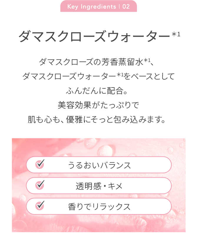 透明感: うるおいを与えて透明感をもたらす *1 ダマスクバラ花水/保湿成分