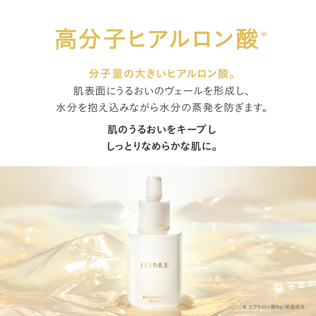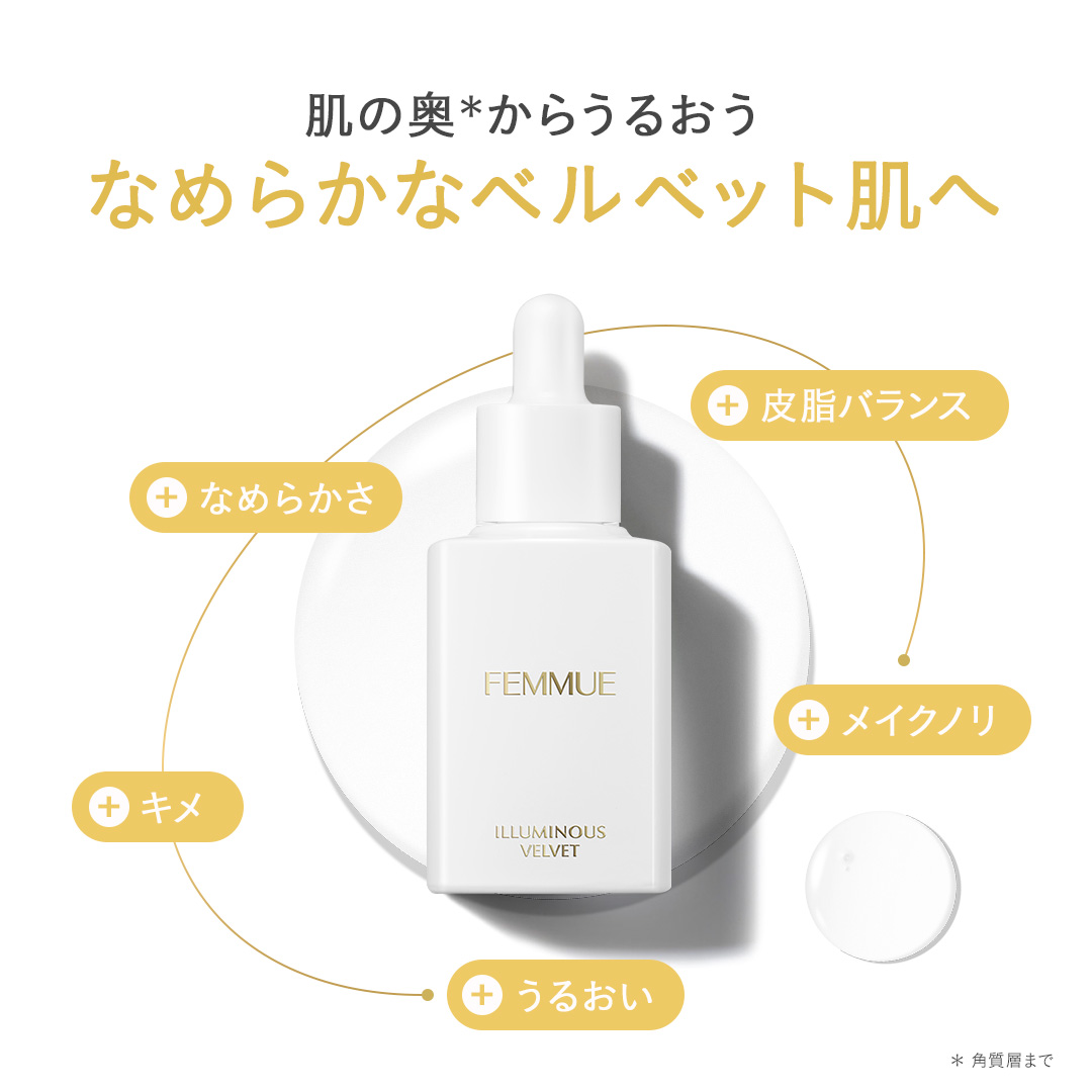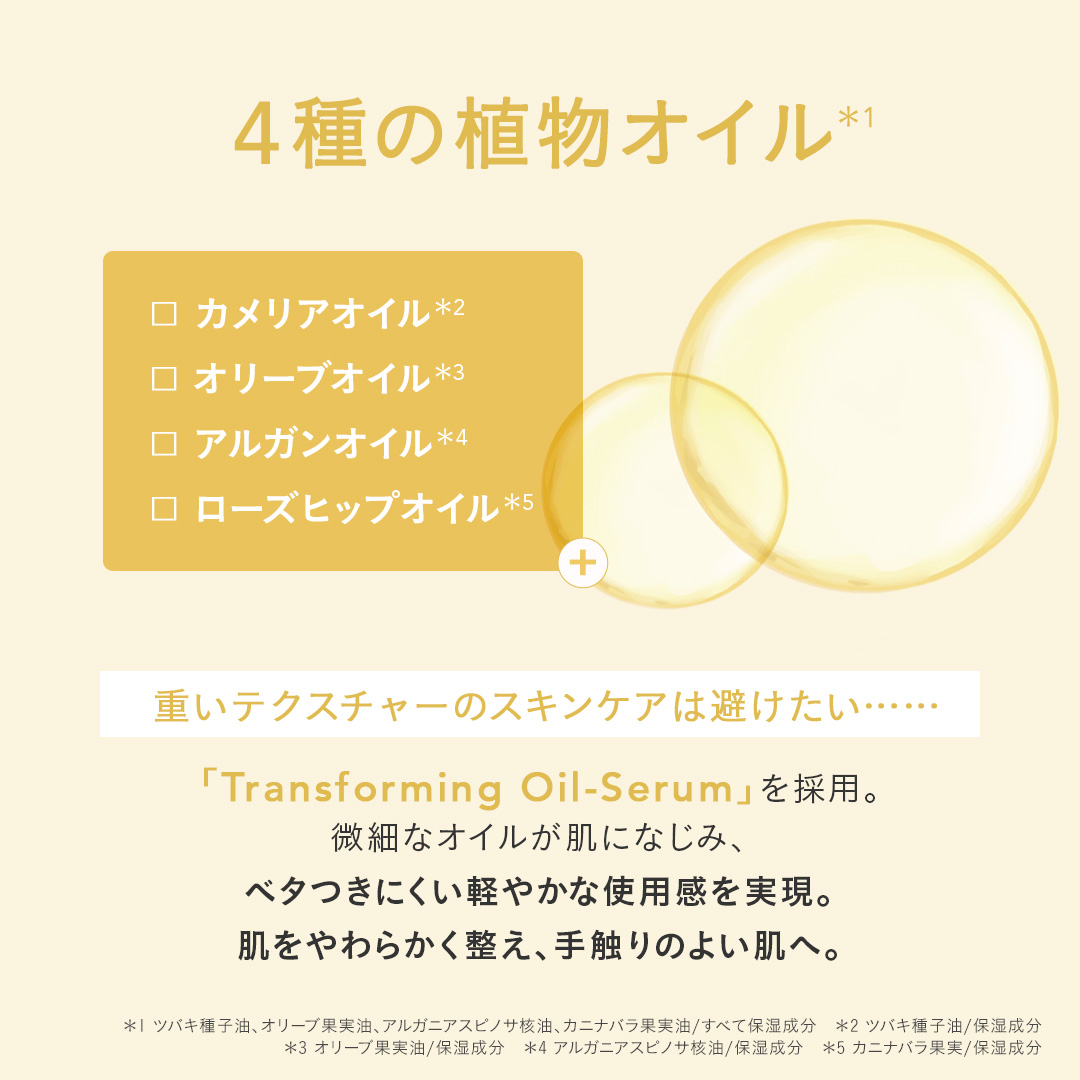 POINT.1 重くないのに、リッチな保湿 ベタつき、テカリなどのお悩みがあると、重いテクスチャーのスキンケアは避けたくなるもの。 そこでFEMMUEは、オイルをしっかりと入れながらもみずみずしい「Transforming Oil-Serum」を開発。 オイルフリーのような軽やかさで、角層のすみずみまで微細なオイル成分を届けます。 〈オイル成分〉 カメリアオイル*1 オリーブオイル*2 アルガンオイル*3 ローズヒップオイル*4 *1 ツバキ種子油/保湿成分 *2 オリーブ果実油/保湿成分 *3 アルガニアスピノサ核油/保湿成分 *4 カニナバラ果実油/保湿成分