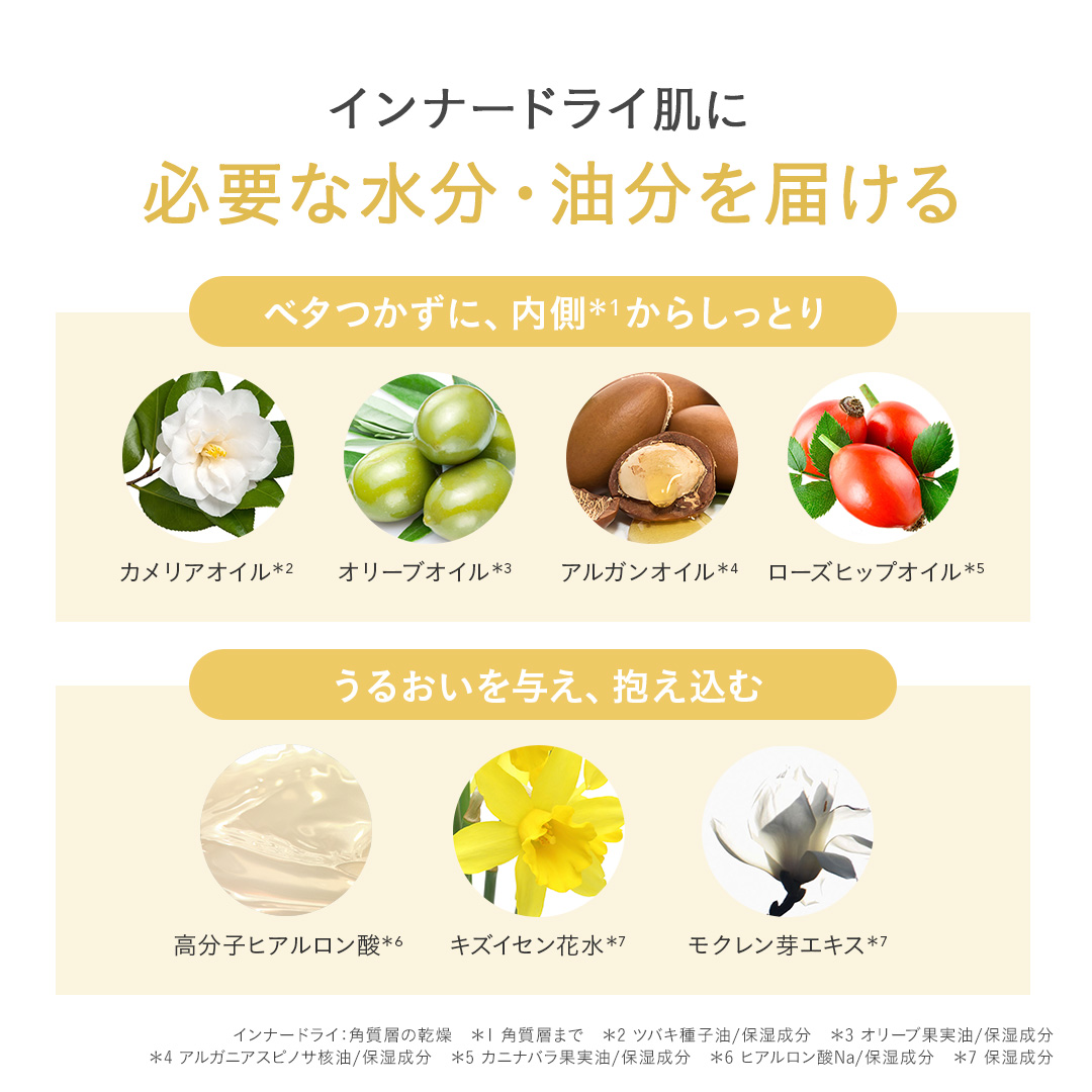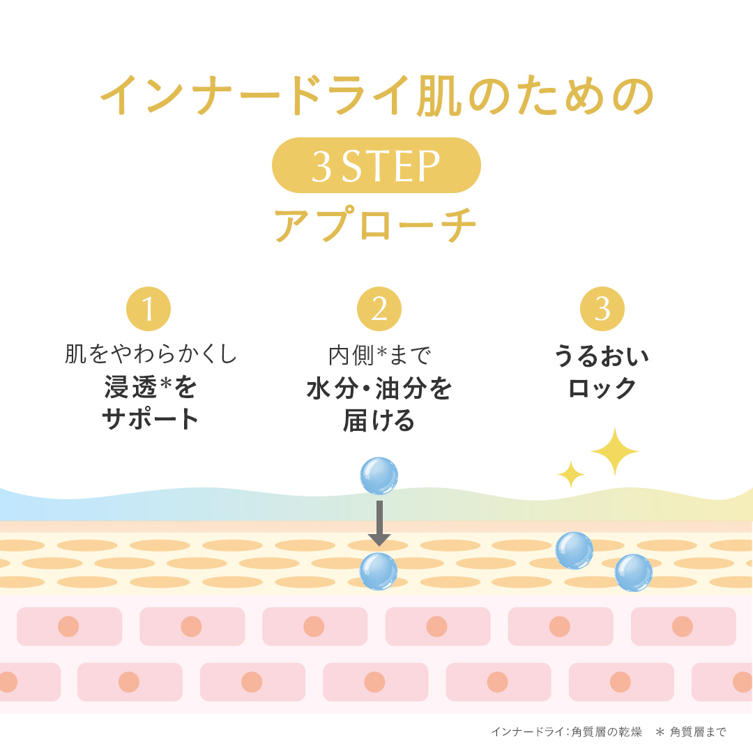 POINT.3 ファーストエイジングケア*1や乾燥対策にも さらっとした仕上がりながら、肌に水分と油分をしっかりと与えます。インナードライ*2対策はもちろんのこと、季節の変わり目の乾燥に悩む肌や、ファーストエイジングケア*1をはじめたい肌にもおすすめです。 *1 年齢に応じたうるおいを与えるケア *2 角質層の乾燥