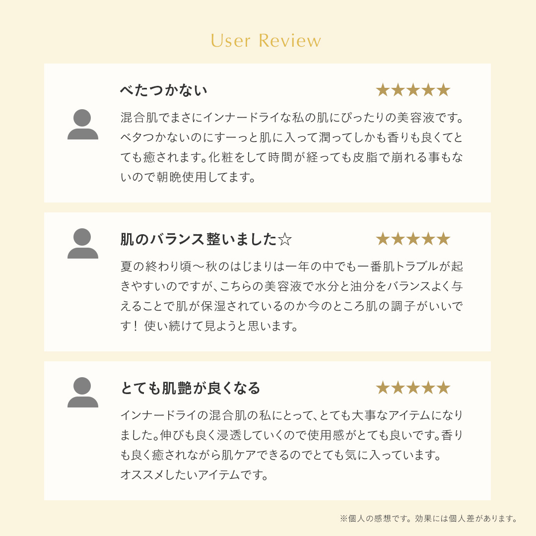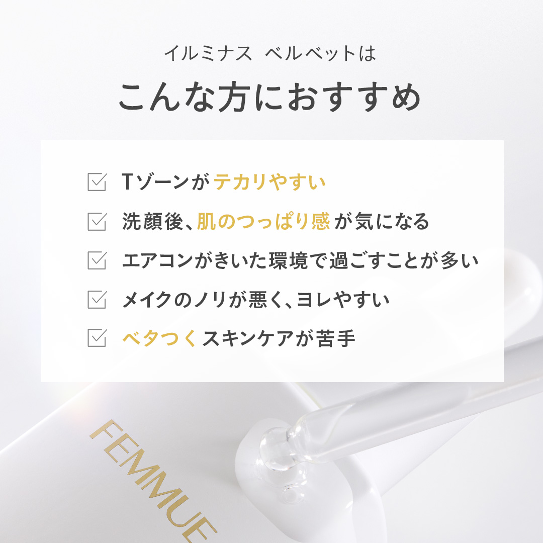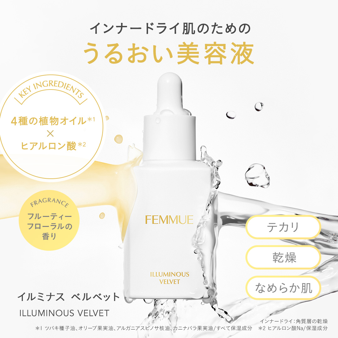 POINT.2 静かな輝きを秘めたなめらかな肌状態へ 高分子ヒアルロン酸*1とナルシス(水仙)*2、マグノリア*3のエキスが肌の保水性をサポート。 うるおいで満たし、肌のキメをやわらかく整えて、なめらかな手触りと輝きのある肌印象へと導きます。 *1 ヒアルロン酸 Na/保湿成分 *2 キズイセン花水/保湿成分 *3 モクレン芽エキス/保湿成分 POINT.3 ファーストエイジングケア*1や乾燥対策にも さらっとした仕上がりながら、肌に水分と油分をしっかりと与えます。インナードライ*2対策はもちろんのこと、季節の変わり目の乾燥に悩む肌や、ファーストエイジングケア*1をはじめたい肌にもおすすめです。 *1 年齢に応じたうるおいを与えるケア *2 角質層の乾燥 POINT.4 幸せで満たすエレガントな香り 厳選された花々のエッセンスを原料に使用。華やかでエキゾチックなジャスミン*1に、フルーティーで濃厚な香り立ちが特徴のマグノリア*2、柑橘系のさわやかさの中に優雅さを秘めたネロリ*3をブレンドした、上品でリッチなフローラルの香り。 ジャスミン*1 マグノリア*2 ネロリ*3 *1マツリカ花エキス *2 ギンコウボク花油 *3 ビターオレンジ花油 ご使用ステップ クレンジング・洗顔 化粧水 導入美容液 美容液 イルミナス ベルベット 乳液・クリーム ご使用方法 朝晩の洗顔後、化粧水で整えた清潔な肌に3~4滴をなじませてください。軽く振ってからお使いください。 Q&A インナードライとはどういった状態ですか? 表面は皮脂でベタついているのに、肌の内側の水分量が不足していて乾燥している状態のこと。 インナードライをそのままにしておくと、シワやたるみ、肌荒れなどの肌トラブルに繋がることも。 適切なスキンケアを心がけましょう。 オイルが入っていますが、夏でもベタつかないですか? オイルフリーのような軽やかさで、角層のすみずみまで微細なオイル成分を届けるので、夏の暑い時期でも心地よくお使いいただけます。 乾燥が気になるときは少し多めに使用しても良いですか? 乾燥が気になる時は、おすすめの使用量にさらに重ねづけをしていただくと肌へのうるおいをより実感いただけます。 全成分 キズイセン花水、BG、水、プロパンジオール、ペンチレングリコール、ベタイン、グリセリン、ビサボロール、デシルグルコシド、ラウリン酸ポリグリセリル-10、カプリリルグリコール、キサンタンガム、結晶セルロース、ヒアルロン酸Na、ツバキ種子油、アデノシン、オリーブ果実油、セルロースガム、乳酸、トコフェロール、オレイン酸ポリグリセリル-10、アルガニアスピノサ核油、カンゾウ根エキス、ツボクサエキス、ツバキ花エキス、セラミドNP、ステアリン酸ポリグリセリル-10、カニナバラ果実油、チャ葉エキス、イタドリ根エキス、モクレン芽エキス、オウゴン根エキス、カミツレ花エキス、ローズマリー葉エキス、マツリカ花エキス、ビターオレンジ花油、ギンコウボク花油 不使用: 合成香料 合成着色料 ご使用上の注意 ●お肌に異常が生じていないかよく注意して使用してください。化粧品がお肌に合わないとき即ち次のような場合には、使用を中止してください。そのまま化粧品類の使用を続けますと、症状を悪化させることがありますので、皮膚科専門医等にご相談されることをおすすめいたします。①使用中、赤味、はれ、かゆみ、刺激、色抜け(白斑等)や黒ずみ等の異常があらわれた場合。②使用したお肌に、直射日光があたって上記のような異常があらわれた場合。●傷やはれもの、湿疹等、異常がある部位にはお使いにならないでください。●乳幼児の手の届かないところに保管してください。●極端に高温又は低温の場所、直射日光のあたる場所には保管しないでください。●自然由来成分を配合しているため、色・香りにばらつきがある場合がありますが、ご使用上問題ございません。 製品サイズ 約W45mm×D45mm×H103mm ◆ラッピングは〈Mサイズ〉がおすすめです。 原産国 MADE IN KOREA カスタマーレビュー 4.8 (51レビュー) m さん 2025/04/23 かわいい いい匂いです。 入れ物も可愛いので見せる収納をしたくなります。 使ったばかりでまだ効果はあまりわからないけど使い続けたいと思います。 今の所肌荒れとかは特にないです。 とにかくいい匂いなところが嬉しいです。 ※カスタマーレビューは個人の感想です。効果には個人差があります。 りんちゃん さん 2025/03/29 べたつかない 混合肌でまさにインナードライな私の肌にぴったりの美容液です。ベタつかないのにすーっと肌に入って潤ってしかも香りも良くてとても癒されます。化粧をして時間が経っても皮脂で崩れる事もないので朝晩使用してます。 ※カスタマーレビューは個人の感想です。効果には個人差があります。 y.r さん 2025/03/23 肌荒れにも 肌荒れがとても気になっている時に購入してみました! 化粧水を変えたりしてみましたが納得いかずにこちらを試してみました。肌荒れが軽減して使い続けいます!乾燥も落ち着いてきました。浸透感が心
