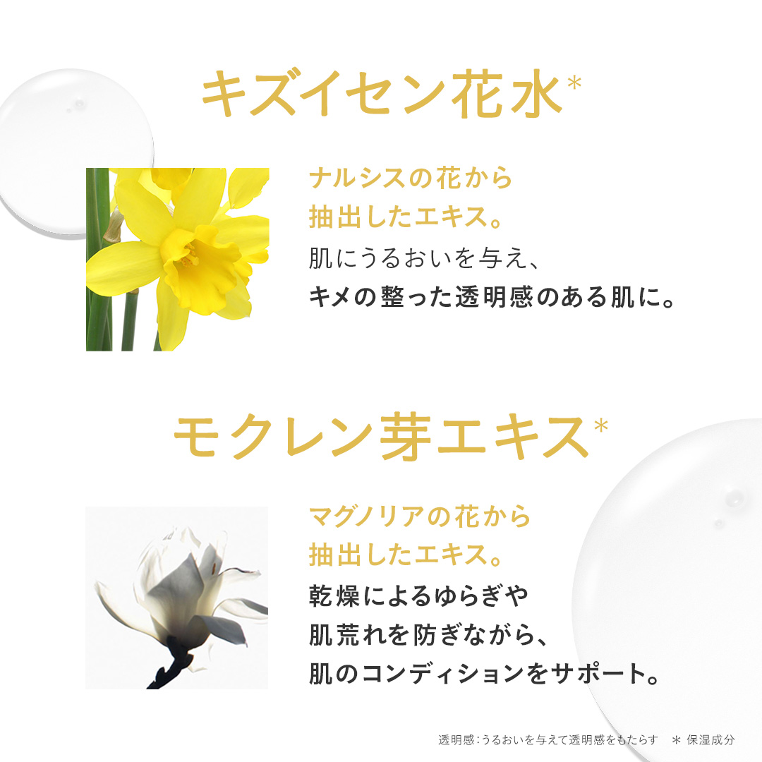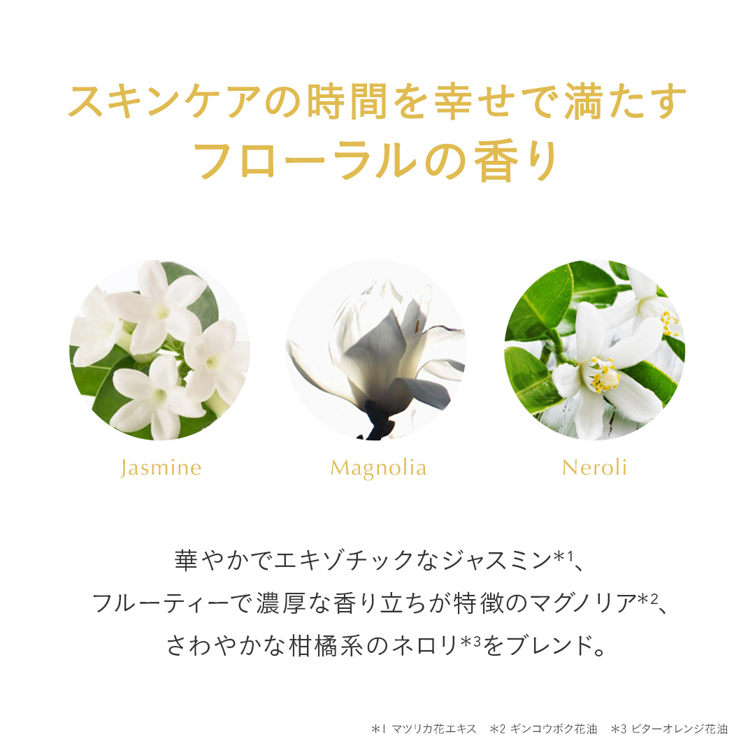 POINT.4 幸せで満たすエレガントな香り 厳選された花々のエッセンスを原料に使用。華やかでエキゾチックなジャスミン*1に、フルーティーで濃厚な香り立ちが特徴のマグノリア*2、柑橘系のさわやかさの中に優雅さを秘めたネロリ*3をブレンドした、上品でリッチなフローラルの香り。 ジャスミン*1 マグノリア*2 ネロリ*3 *1マツリカ花エキス *2 ギンコウボク花油 *3 ビターオレンジ花油