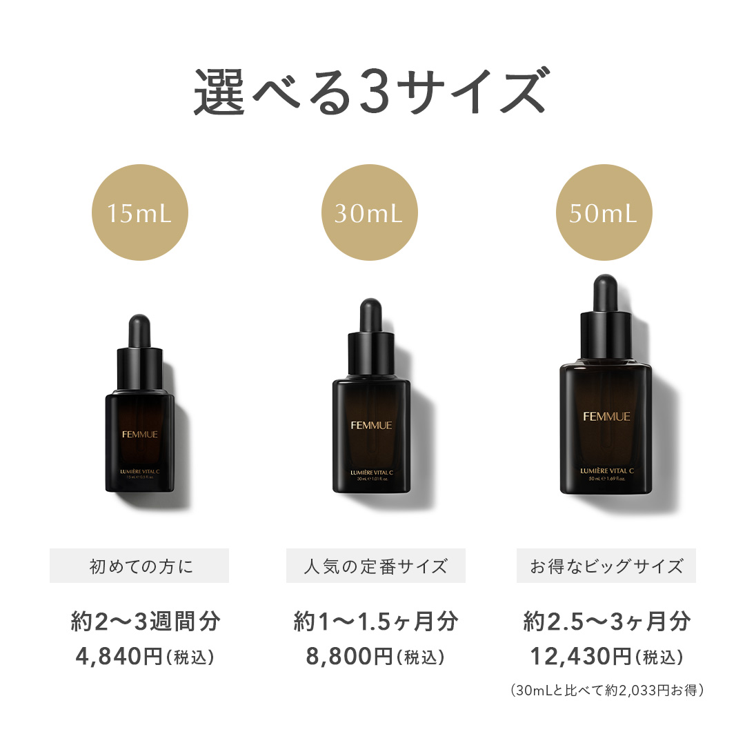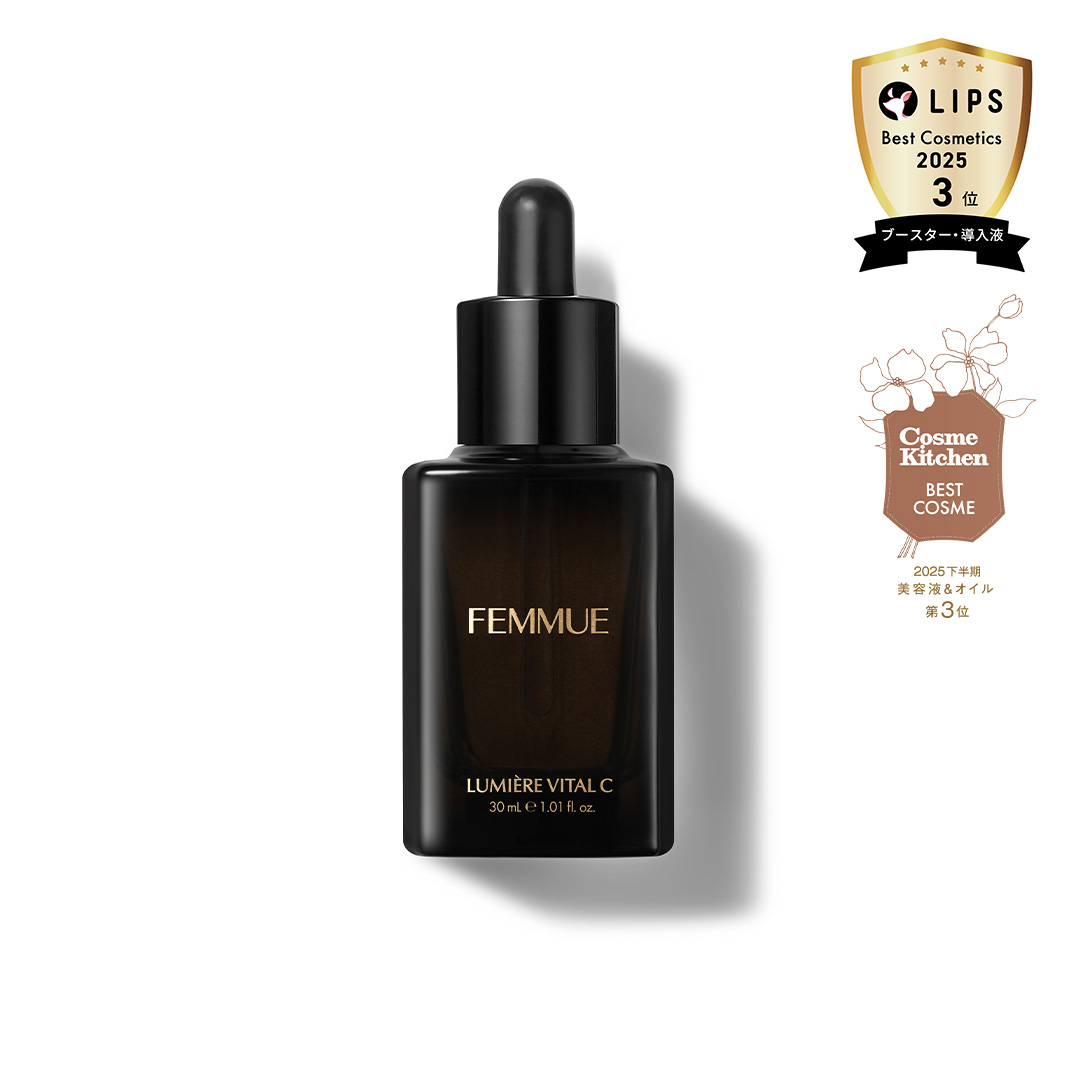 POINT.1 乾燥による毛穴の目立ちやくすみが気になる肌のために、透明感をさらに突き詰めて ビタミンCを安定化して届けるビタミンC誘導体*1と3つのツヤ成分*2という、ルミエール ヴァイタルCの主役となる成分はそのままに、透明感を追求して成分の種類や量を選定。より多角的に透明感へアプローチできるスペックとなりました。 透明感:うるおいを与えて透明感をもたらす *1 アスコルビルグルコシド/整肌成分 *2 サフラワー油、ビサボロール、トコフェロール/すべて保湿成分 透明感のある肌に導くエレメント ●ビタミンC誘導体*1 ビタミンCを安定化して肌に届ける、「ルミエール ヴァイタルC」の主役となる成分。 ●ナイアシンアミド*2 ビタミン B3。美容のオールラウンダーとも呼ばれ、キメの整った透明感を与えます。 ●Made Snow(マデカッソシド) 肌をおだやかに整え、みずみずしい状態をキープ。 ●バクガエキス*3 発芽した大麦粒から抽出された天然の保湿成分。美しくなめらかな肌をサポート。 ●3つのツヤ成分(サフラワー油*3、ビサボロール*3、トコフェロール*3) 肌になじみがよく、肌に不足しがちな油分をプラスしてうるおいを与えます。 透明感:うるおいを与えて透明感をもたらす *1 アスコルビルグルコシド/整肌成分 *2 整肌成分 *3 保湿成分