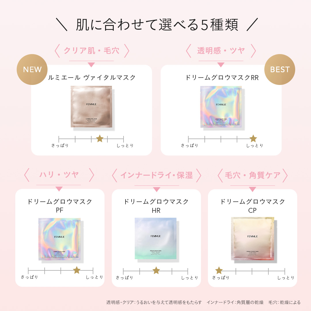 TIPS.2 気になるごわつきや、毛穴ケアに ドリームグロウマスク CPでケアした後は〈ルミエール ヴァイタルC〉をお使いいただくのがおすすめです。安定化したビタミンC誘導体*配合で、肌のキメを整えて、よりつるんとしたなめらかな肌に導きます。使用する順番は、ブースター効果のある〈ドリームグロウマスク CP〉→〈ルミエール ヴァイタルC〉の順でご使用ください。* アスコルビルグルコシド/整肌成分