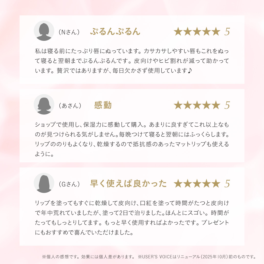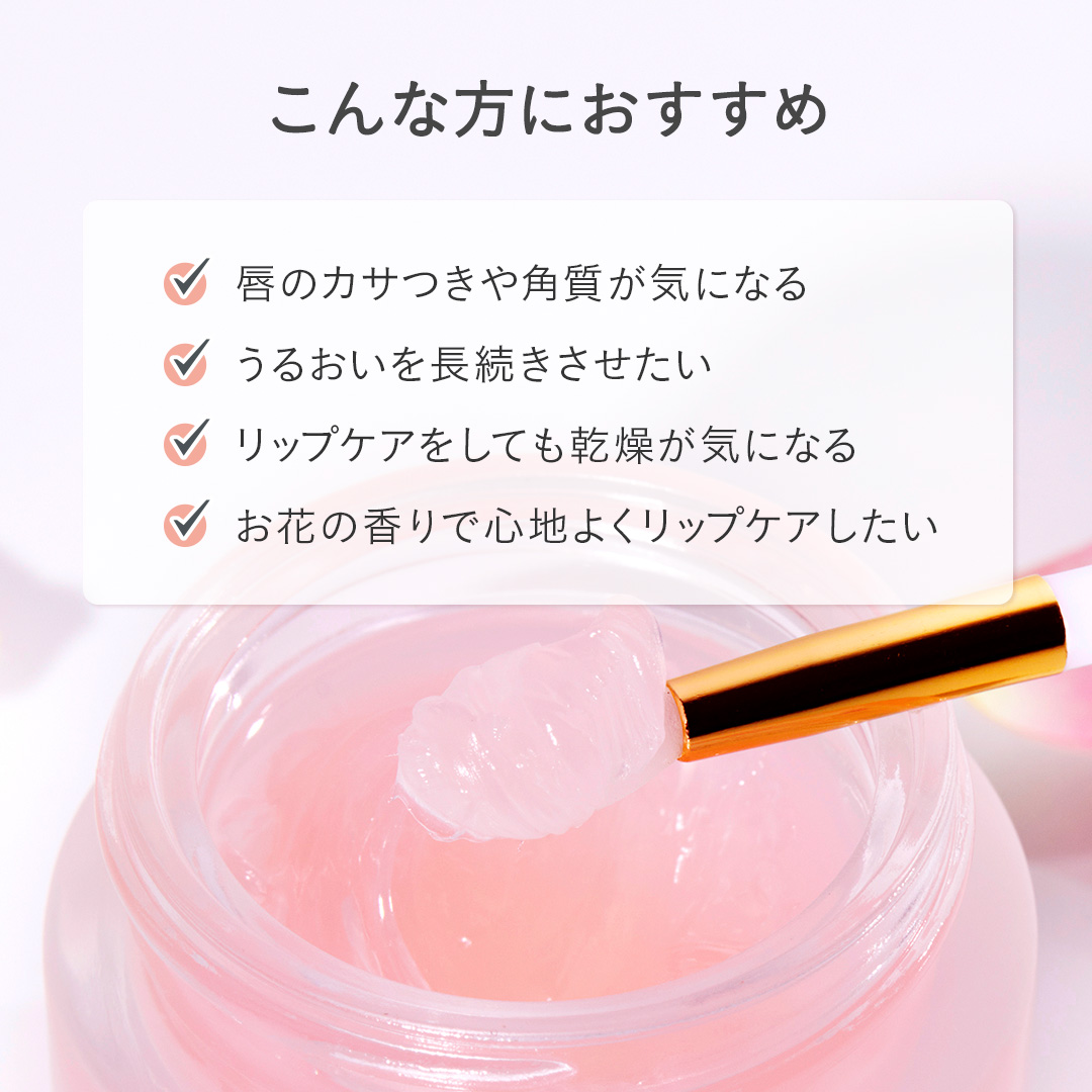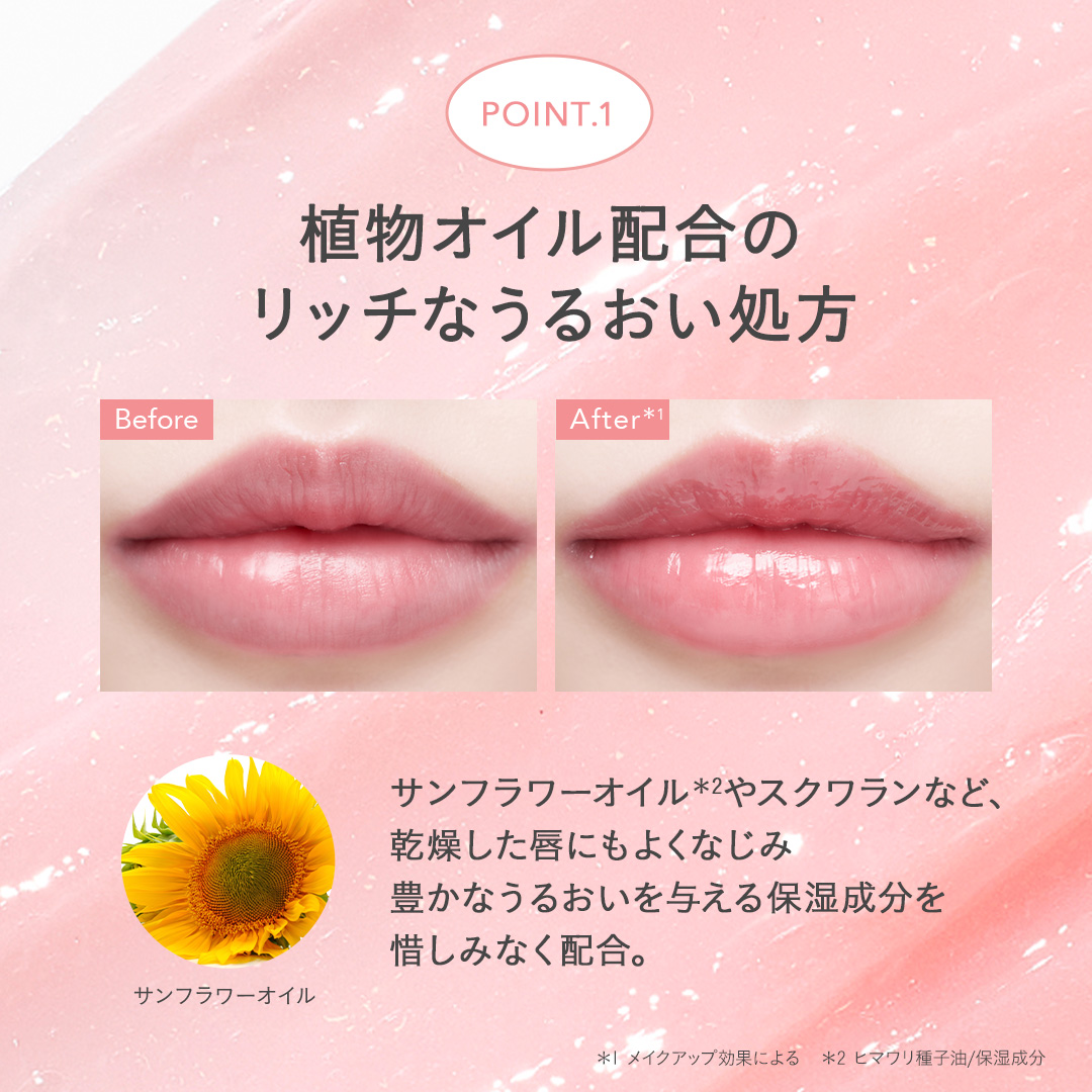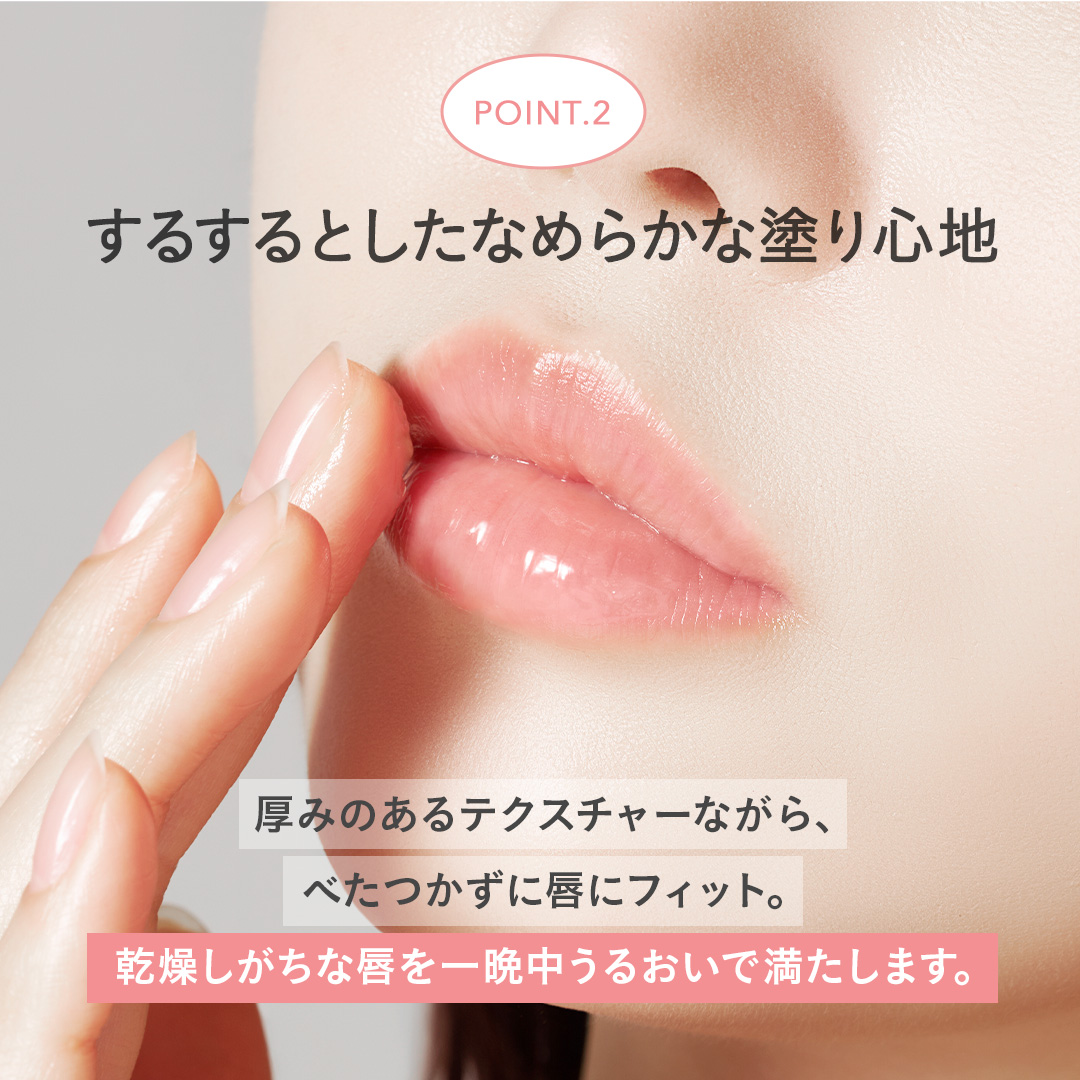 POINT.1 一晩中、乾燥から唇を守り、翌朝にはしっとり・ふっくらとした唇へ サンフラワーオイル*1やスクワランなど、唇によくなじみ豊かな潤いを補給する、植物由来の保湿成分を惜しみなく配合。ボリュームある厚みを持ちながらべたつきを感じにくく、するするとしたなめらかな塗り心地が特徴です。就寝中しっとり集中保湿し、翌朝には、しっとり・ふっくらとした唇へ。夜だけでなく日中のリップケアにももちろんお使いいただけます。 *1 ヒマワリ種子油