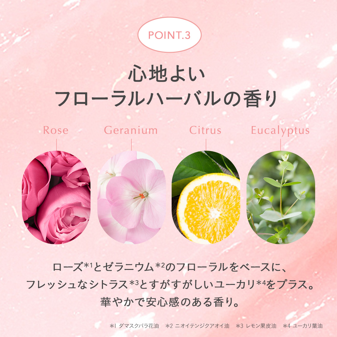 POINT.2 うっとりと浸れる華やかなフローラルノート ローズ*1とゼラニウム*2の高貴なフローラルをベースに、フレッシュなシトラス*3とすがすがしいユーカリ*4をプラス。優雅なフローラルブーケにポジティブな光が差し込むような、華やかで安心感のある香りです。 *1 ダマスクバラ花油 *2 ニオイテンジクアオイ油 *3 レモン果皮油 *4 ユーカリ葉油