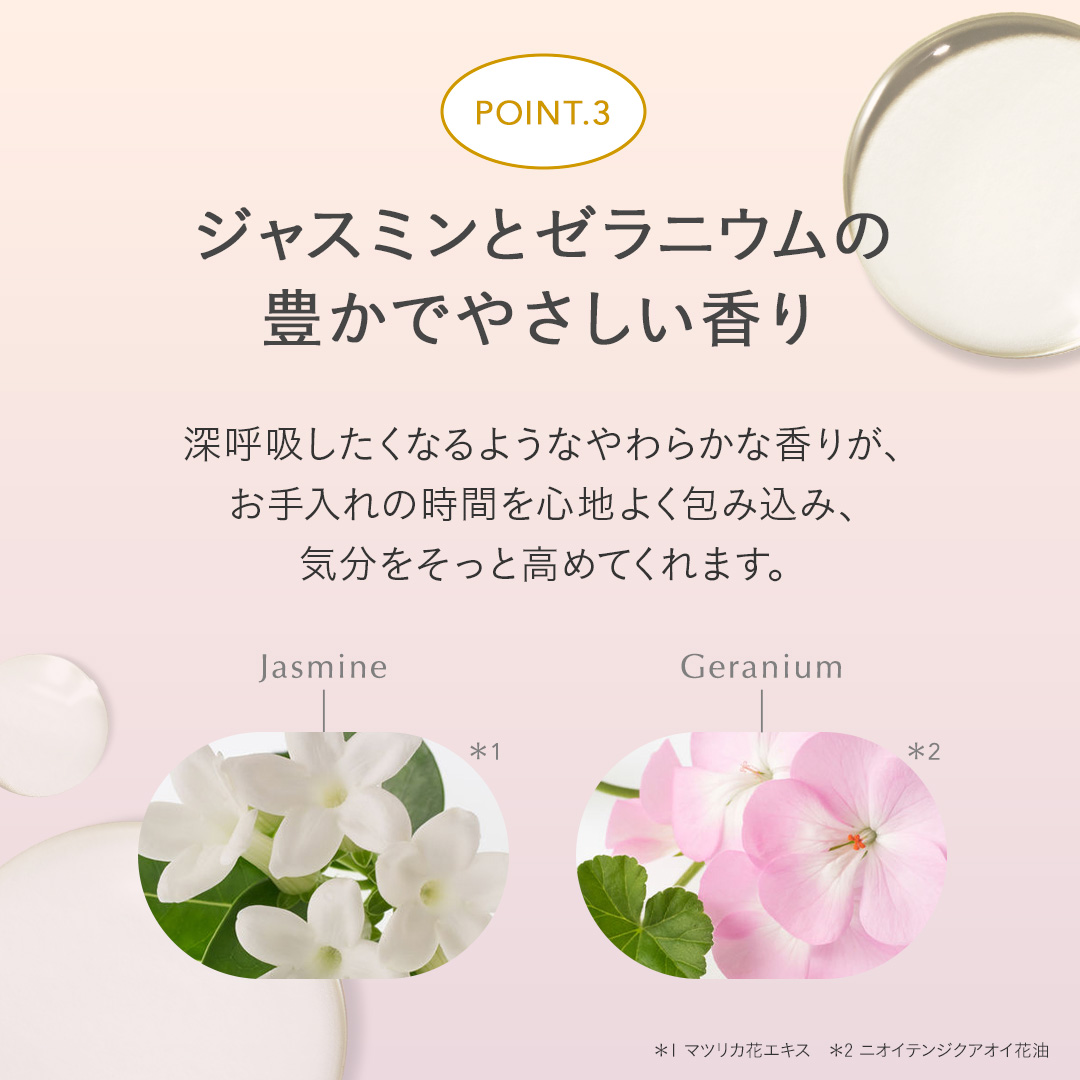 POINT.3 ゼラニウム*1とジャスミン*2の豊かでやさしい香り フローラルなゼラニウム*1に、上品で華やかなジャスミン*2がやさしく調和。深呼吸したくなるような豊かな香りが、お手入れの時間を心地よく包み込み、気分をそっと高めてくれます。 *1 ニオイテンジクアオイ花油 *2 マツリカ花エキス ゼラニウム ジャスミン
