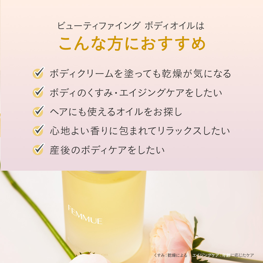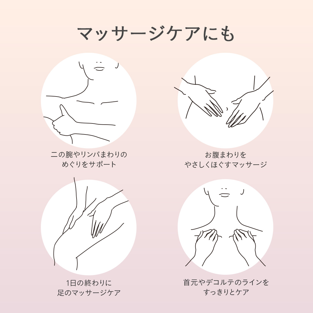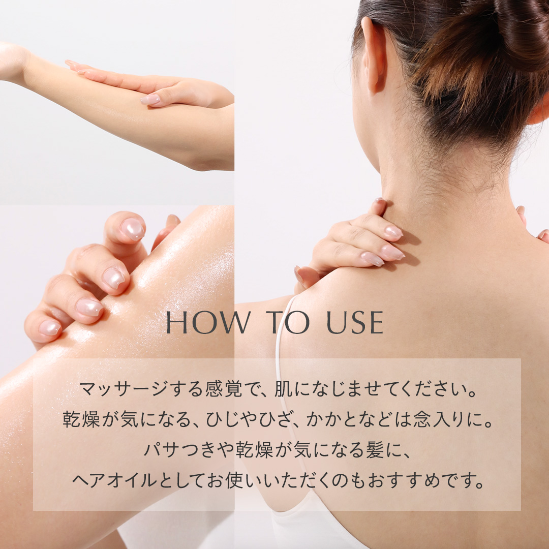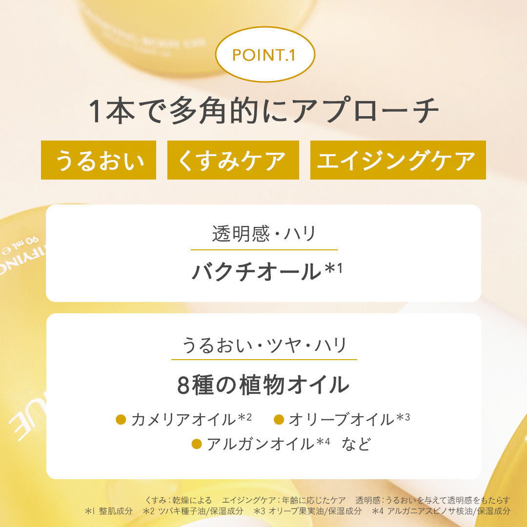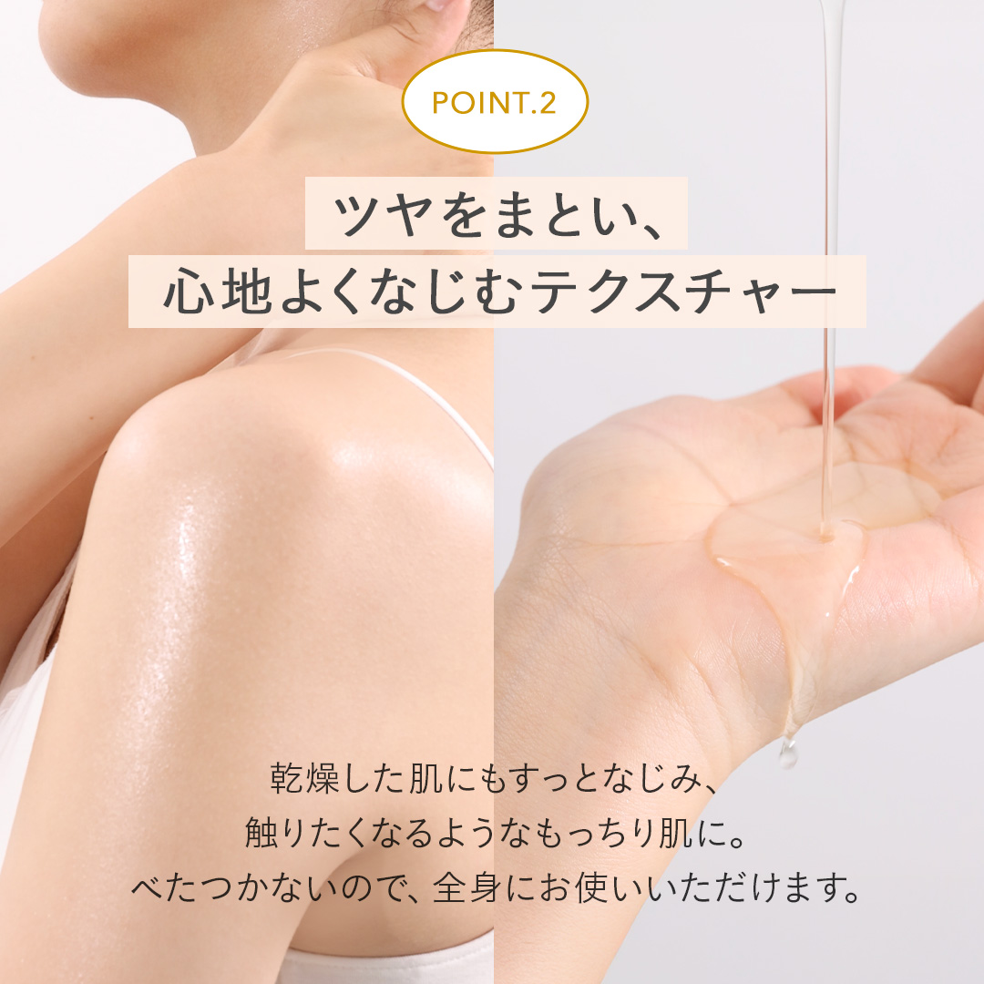 POINT.1 さまざまな植物オイルの贅沢ブレンドが肌に多角的にアプローチ 肌へのアプローチや使用感が異なるさまざまな植物オイルをブレンドし、贅沢に配合。オレイン酸を豊富に含むカメリアオイル*1をベースに、リッチなうるおいをもたらすオリーブオイル*2、さらっと軽やかなサンフラワーオイル*3、ハリや弾力をサポートするアルガンオイル*4などがバランスよく肌になじみます。いつものお手入れでは得られない、多角的なスキンケア効果と心地よさを叶える配合で、肌をやわらかく整えながら、うるおいとツヤに満ちたすこやかな状態へ導きます。 *1 ツバキ種子油/保湿成分 *2 オリーブ果実油/保湿成分 *3 ヒマワリ種子油/保湿成分 *4 アルガニアスピノサ核油/保湿成分