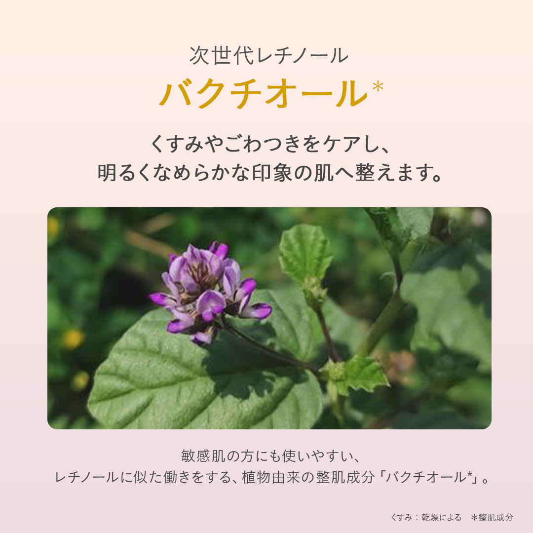 POINT.2 レチノールに似ているとも言われるバクチオール*がすこやかな肌に整える レチノールに似た働きがあると言われる植物由来の成分バクチオール*を配合。敏感に傾きがちな肌の方でも取り入れやすく、乾燥によるくすみやごわつきにもおだやかに働きかけ、明るくなめらかな印象に導きます。 * 整肌成分明るく:うるおいを与えて透明感をもたらす