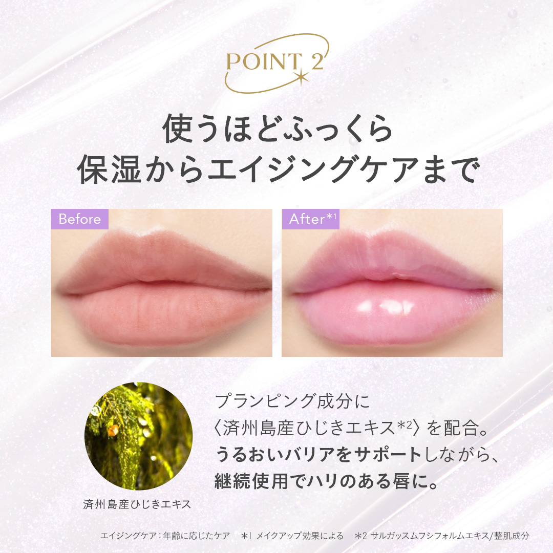 POINT.2 唇をすこやかに整える済州島産ひじきエキス*を配合 海藻の粘り気成分「フコイダン」が豊富に含まれるひじきエキス*が、唇のうるおいバリアをサポートしながら、ふっくらハリのある唇へと導きます。 * サルガッスムフシフォルムエキス/整肌成分