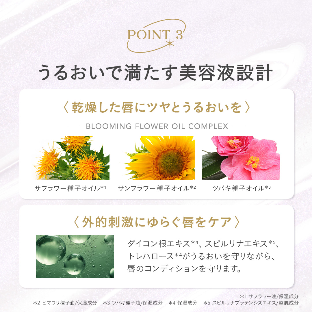 POINT.3 うるおい豊かでなめらかな唇へと導くボタニカル美容液設計 多彩な成分を含む3種の植物オイルをブレンドした「ブルーミングフラワーオイルコンプレックス」配合。唇のうるおいをキープしながらエイジングケアし、美しいツヤももたらします。 エイジングケア:年齢に応じたケア BLOOMING FLOWER OIL COMPLEX ●サフラワー種子オイル*1 ビタミンE・Fを含み、唇のうるおいバリアをサポート。乾燥を防ぎ、やわらかくしっとりとした状態を維持します。 ●サンフラワー種子オイル*2 オメガ6含有。軽いテクスチャーで唇にするっとなじみ、深い*3うるおいを与えてなめらかに整えます。 ●ツバキ種子オイル*4 肌と類似した組成を持つオイル。オレイン酸、ビタミンE、オメガ6、オメガ9を含み、唇をエイジングケア。 ●敏感に傾きがちな唇を保護するコンプレックス ダイコン根エキス*5、スピルリナエキス*6、トレハロース*5がうるおいを守りながら、唇のキメを整え、ふっくらとツヤのある印象へ。敏感に傾きがちな唇のコンディションを守ります。 *1 サフラワー油/保湿成分 *2 ヒマワリ種子油/保湿成分 *3 角質層まで *4 ツバキ種子油/保湿成分 *5 保湿成分 *6 スピルリナプラテンシスエキス/整肌成分 エイジングケア:年齢に応じたうるおいを与えるケア サフラワー種子オイル サンフラワー種子オイル ツバキ種子オイル