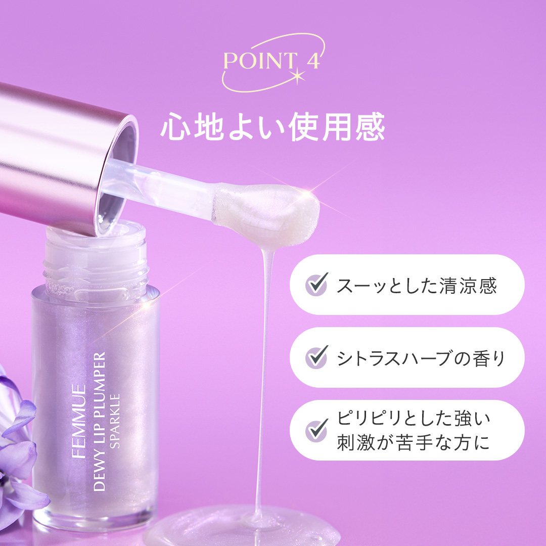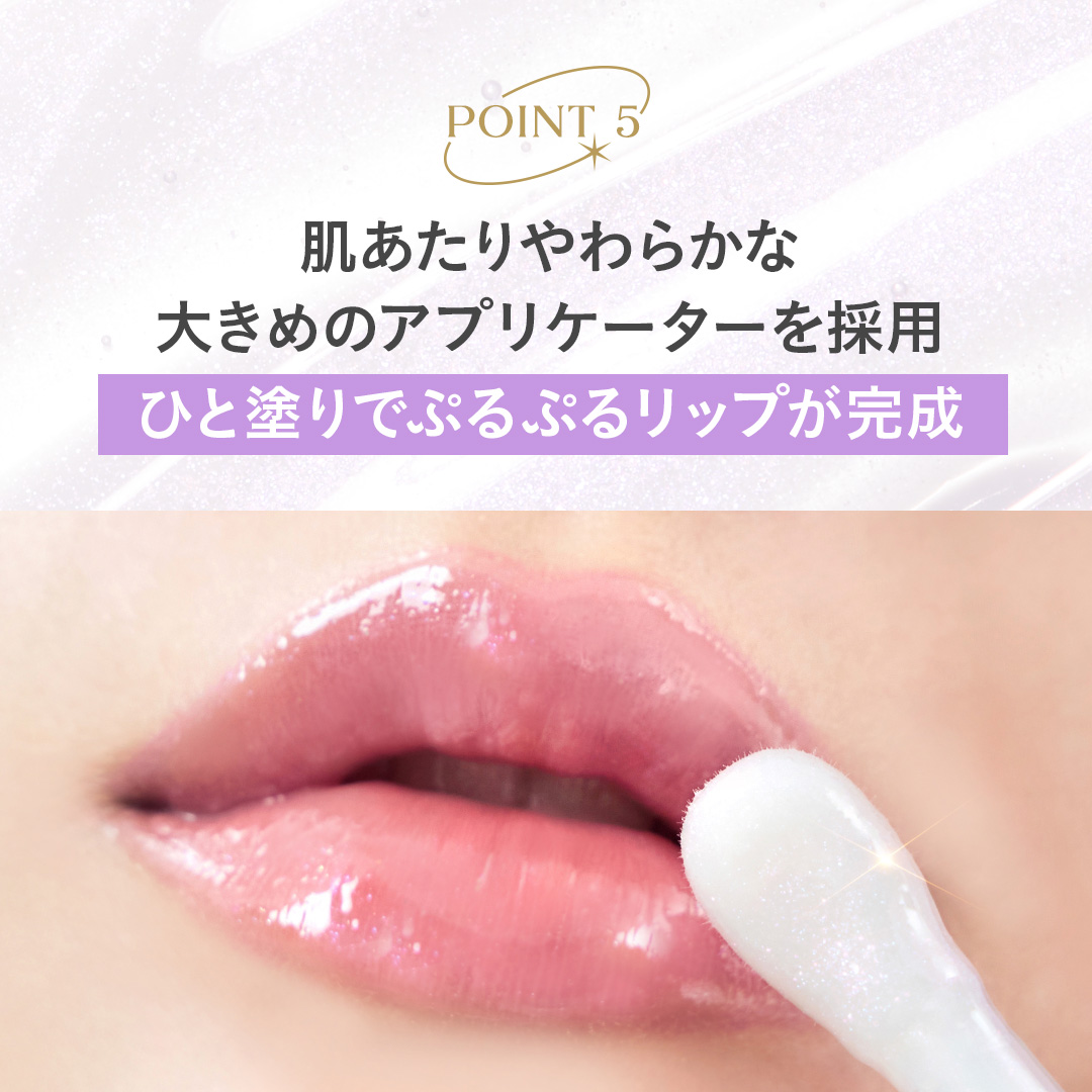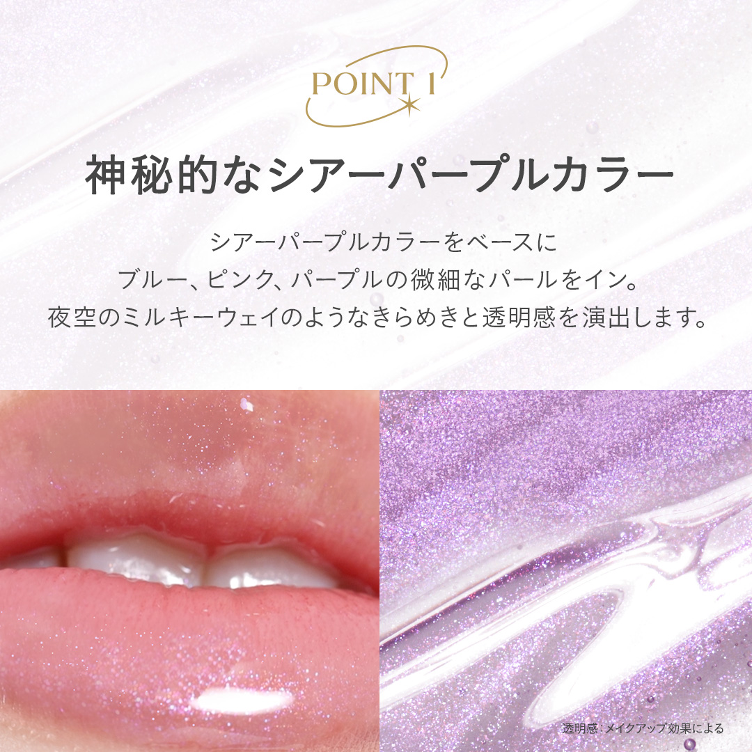 POINT.1 パープルカラー&3色の繊細パールが透明感と気品を演出 パープルカラーのベースが成熟した魅惑的なムードを演出し、ブルー、ピンク、パープルの繊細なパールが、ミルキーウェイのような輝きを放ちます。 透明感:メイクアップ効果による BIG APPLICATOR パールを唇にまんべんなく塗ることができる大きめのアプリケーターを採用。