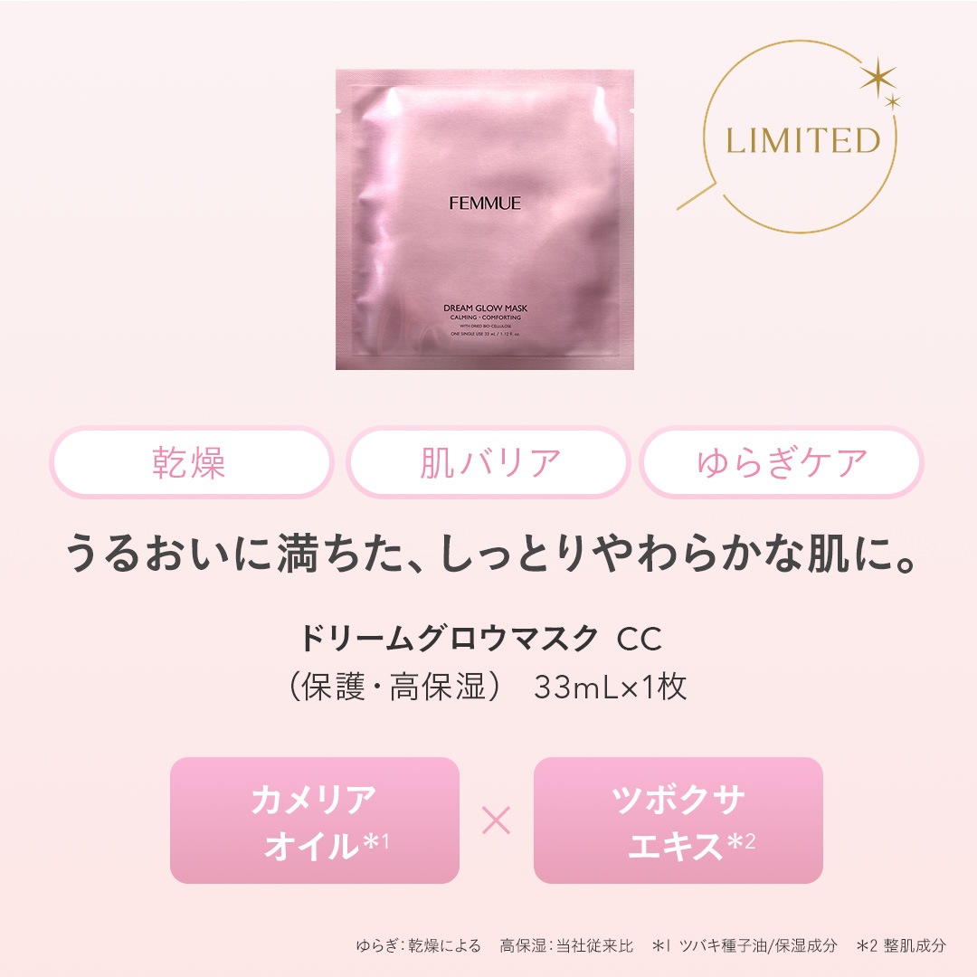 ITEM.2 ドリームグロウマスク CC(保護・高保湿*1)33mL×1枚 角質層のバリア機能をうるおいでサポートし、いきいきとした肌へ導くシートマスク。 カメリアオイル*2が肌のキメを美しく整え、乾燥などによる外部刺激から肌を守ります。クリーミーなセラムを含浸したシートマスクは保湿効果・エモリエント効果にすぐれ、花びらのようなふんわりとやわらかい肌へ導きます。さらにシカケア成分のツボクサエキス*3や、肌を保護するハマメリス葉エキス*3が、肌を整えながらうるおいを与えます。本セット限定で復刻の定番販売のないシートマスクです。ダマスクローズとジャスミンにベルガモットをプラスした安らぎの香り。 *1 当社従来比 *2 ツバキ種子油/保湿成分 *3 整肌成分