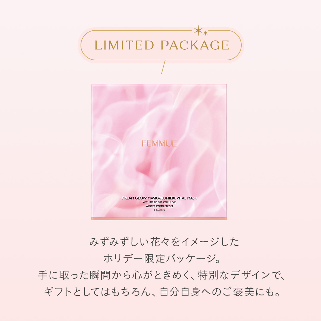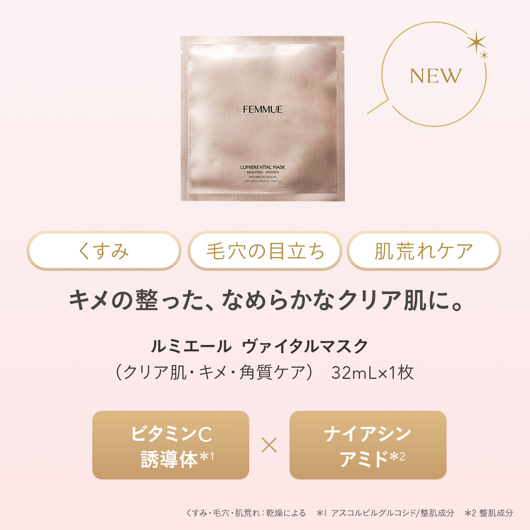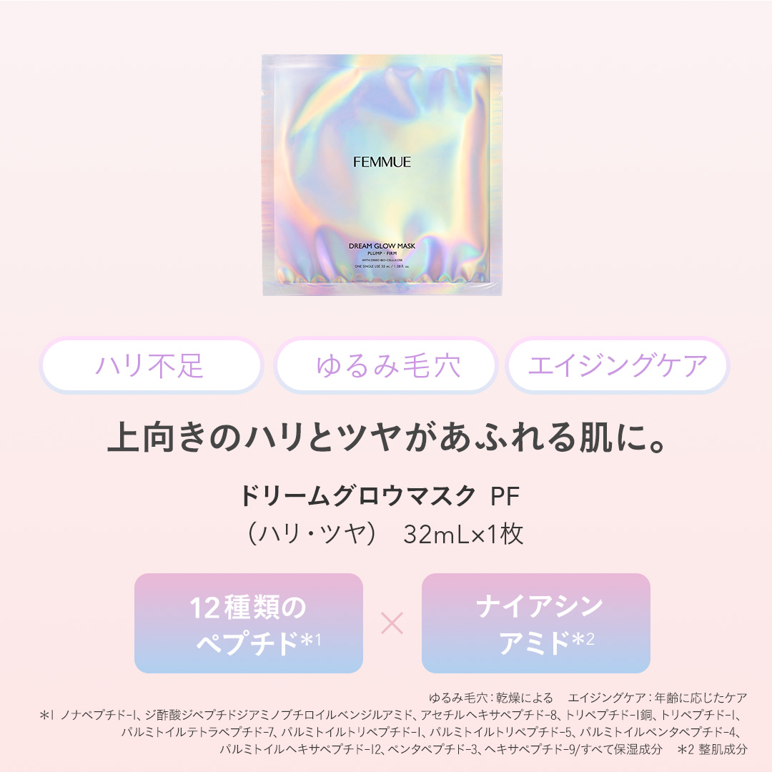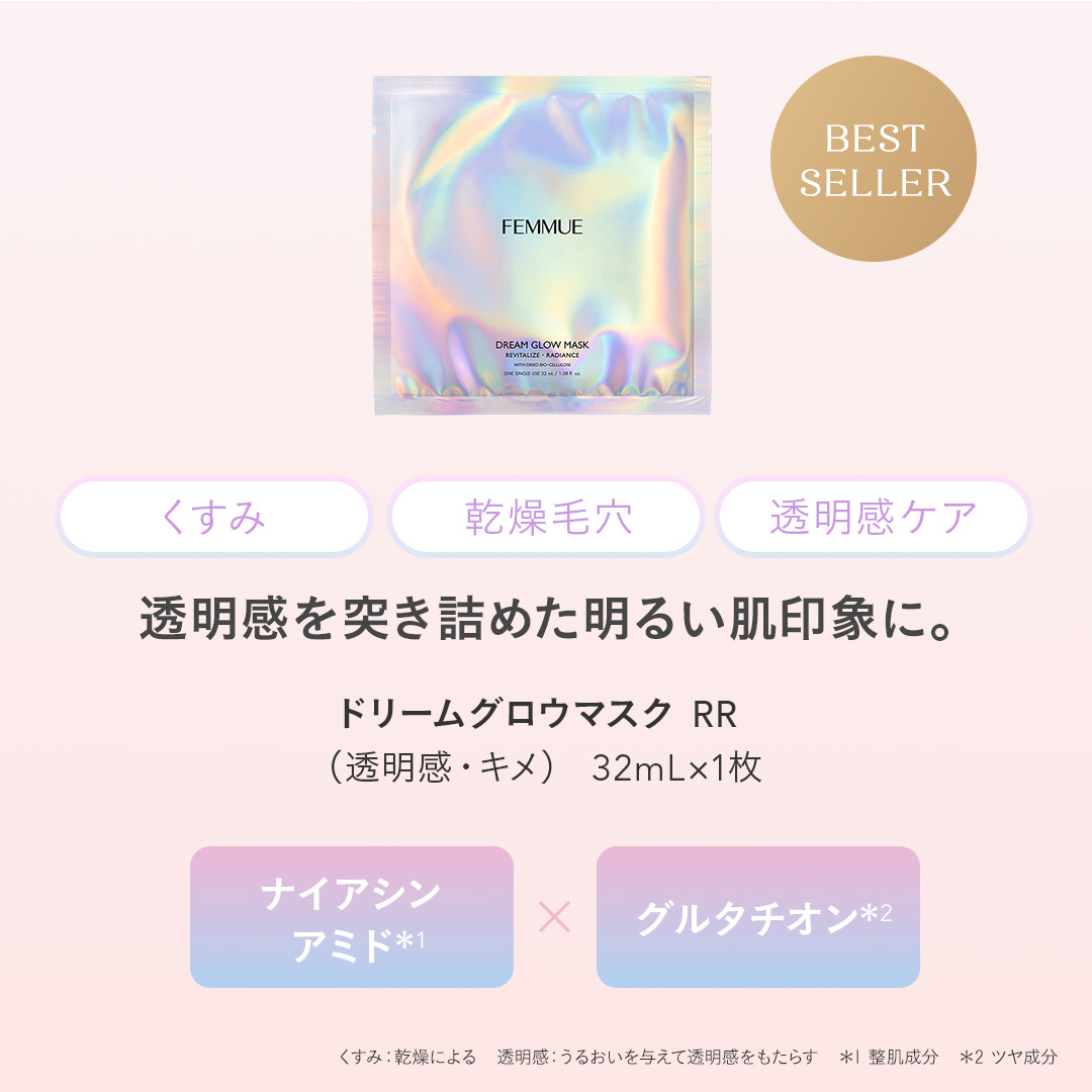 ITEM.3 ドリームグロウマスク RR(透明感・キメ)32mL×1枚 紫外線や乾燥によるくすみ肌をケアする、透明感を突き詰めた人気No.1のシートマスク。 ナイアシンアミド*1とカメリアオイル*2のコンビネーションに、グルタチオン*1や、すこやかな肌をサポートするビタミンコンプレックス*3、肌のキメを整えるエーデルワイスカルス培養エキス*1を配合。ハリとツヤを与えながら、澄んだうるおいの映える肌へと導きます。ほのかなネロリの香り。 くすみ:乾燥によるくすみ 透明感:うるおいを与えて透明感をもたらす 人気No.1:FEMMUE公式オンラインストア シートマスク部門売上/集計期間:2021年1月1日〜2024年12月31日 *1 整肌成分 *2 ツバキ種子油/保湿成分 *3 パントテン酸Ca、アスコルビルリン酸Na、酢酸トコフェロール、ピリドキシンHCl/すべて整肌・保湿成分