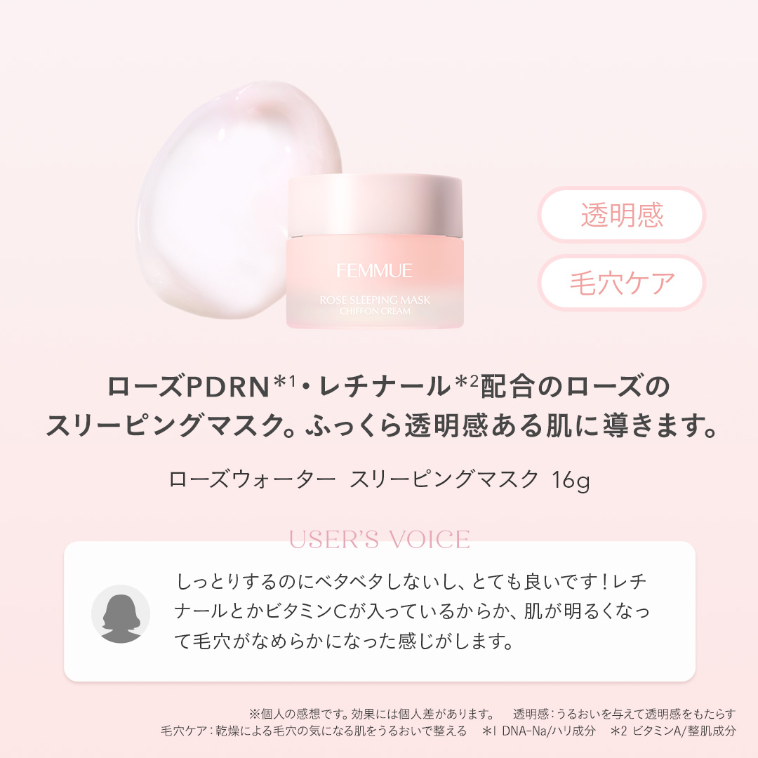 ITEM.4 ローズウォーター スリーピングマスク16g 翌朝の肌にふっくら透明感をもたらす、ローズの睡眠美容マスク。 POINT ダマスクローズウォーター*1を約80%配合。ローズPDRN*2やレチナール*3、ビタミンC*4などの美容成分が肌ストレス*5にアプローチして、ハリと透明感を与えます。ぷるんとみずみずしいテクスチャーで、べたつかずにすっきり。たっぷりと塗って一晩置くだけで、なめらかでみずみずしい肌へと整えます。夜だけでなく日中の保湿クリームとしてもお使いいただけます。やさしく自然なローズ*6の香り。 ご使用方法 夜、スキンケアの最後にパール3粒大を肌にのせ、よくなじませます。そのまま拭き取らずにお休みください。スキンケアの最後にクリームとして使用することもできます。パール1粒大でさっぱりとした使用感、2粒大でしっとりとした使用感に。 透明感:うるおいを与えて透明感をもたらす *1 ダマスクバラ花水/保湿成分 *2 DNA-Na/ハリ成分 *3 ハリ・ツヤ成分 *4 アスコルビン酸/整肌成分 *5 乾燥など *6 ダマスクバラ花油