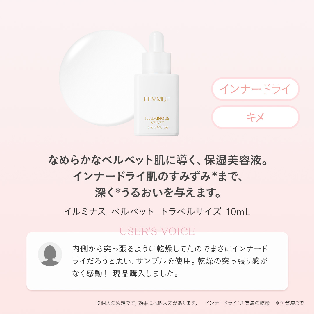 ITEM.3 イルミナス ベルベット トラベルサイズ10mL オイルインなのに軽やかなインナードライのための保湿美容液。 POINT 「一見ベタつきを感じていても、実はうるおいが足りていない」「乾燥しはじめている時期なのに自覚がない」そんなインナードライ肌をうるおいで満たす美容液。オイルを含みながらもみずみずしく軽やかなテクスチャーで、オイルリッチなスキンケアやベタつきを苦手とする肌でも心地よくお使いいただけます。微細なオイルが肌にしっかりとなじみ、キメが整った状態に。まるでベルベットのように上品な輝きのあるなめらかな肌へと導きます。 ご使用方法 朝晩の洗顔後、化粧水で整えた清潔な肌に3~4滴をなじませてください。軽く振ってからお使いください。 インナードライ:角質層の乾燥