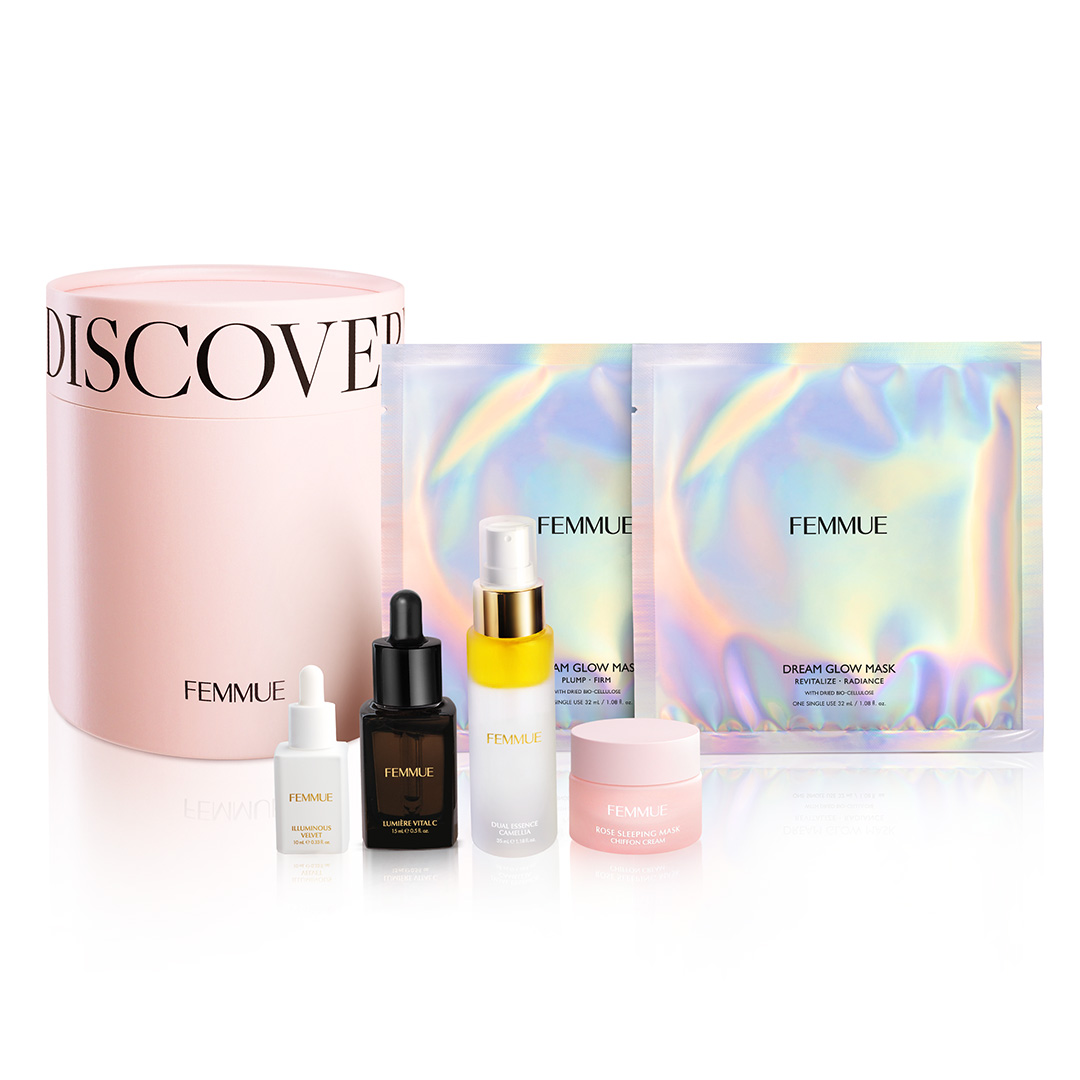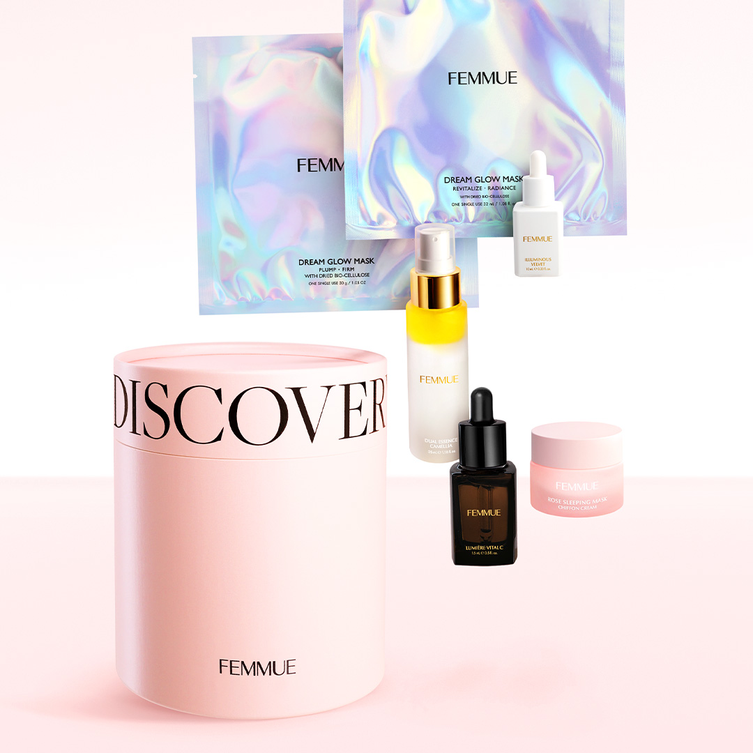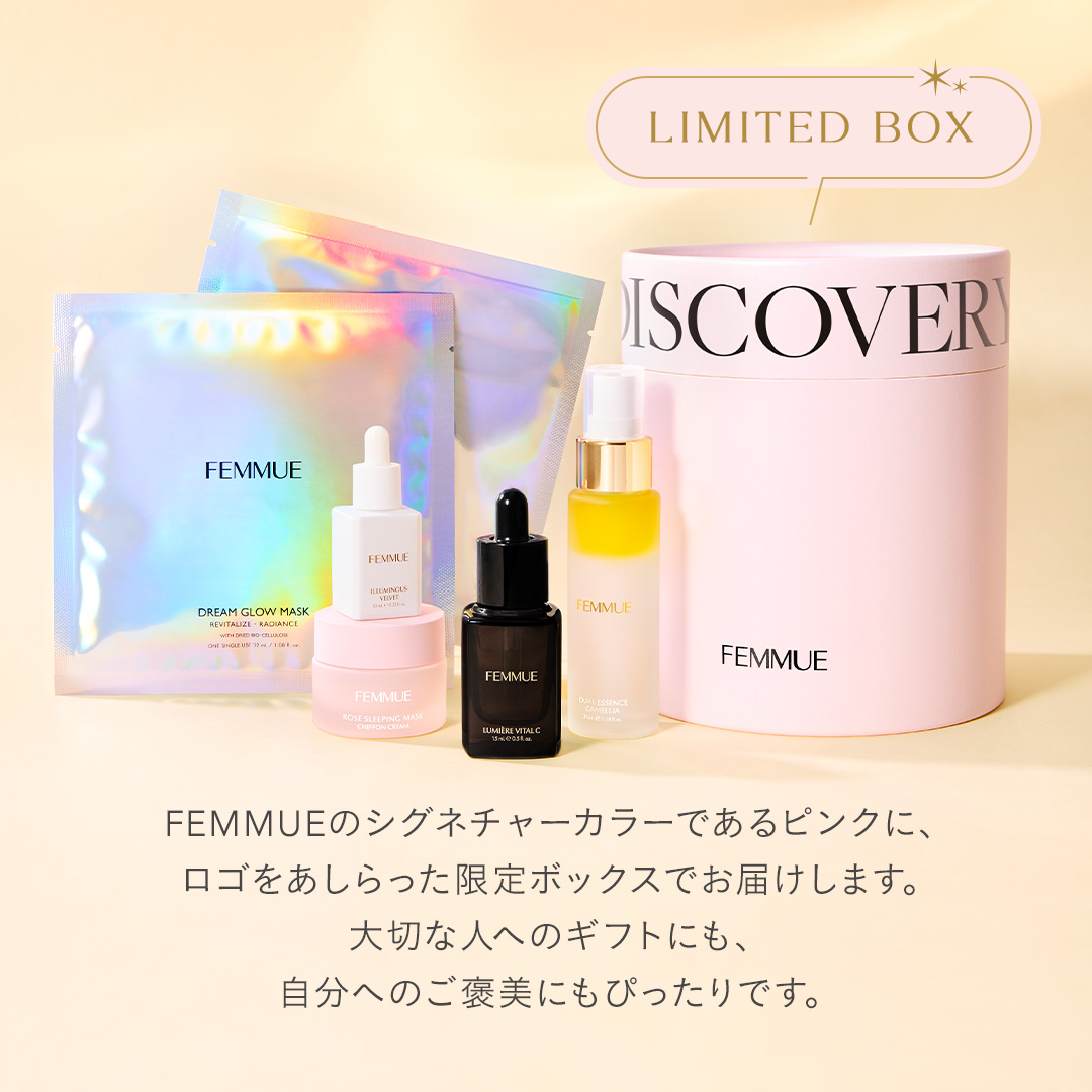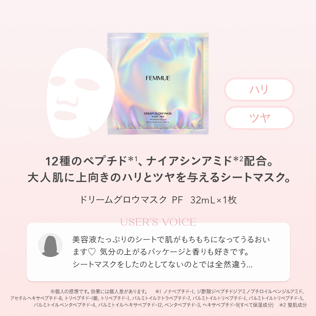 ITEM.5 ドリームグロウマスク RR(透明感・キメ)32mL×1枚 紫外線や乾燥によるくすみ肌をケアする、透明感を突き詰めた人気No.1のシートマスク。 ナイアシンアミド*1とカメリアオイル*2のコンビネーションに、グルタチオン*1や、すこやかな肌をサポートするビタミンコンプレックス*3、肌のキメを整えるエーデルワイスカルス培養エキス*1を配合。ハリとツヤを与えながら、澄んだうるおいの映える肌へと導きます。 ほのかなネロリの香り。 ご使用方法 [STEP1]マスクを袋から出して広げ、両面の保護シートをはがします。(裏表はありません) [STEP2]マスクを目の位置から合わせ、空気が入らないように貼っていきます。ヨレなどを調整し、顔に密着させます。 [STEP3]10~15分後にマスクをはがし、肌の上に残った液をなじませます。その後、美容液等でお手入れをしてください。 ※両面の保護シートは必ずはがしてお使いください。 くすみ:乾燥によるくすみ 透明感:うるおいを与えて透明感をもたらす 人気No.1:FEMMUE公式オンラインストア シートマスク部門売上/集計期間:2021年1月1日〜2024年12月31日 *1 整肌成分 *2 ツバキ種子油/保湿成分 *3 パントテン酸Ca、アスコルビルリン酸Na、酢酸トコフェロール、ピリドキシンHCl/すべて整肌・保湿成分