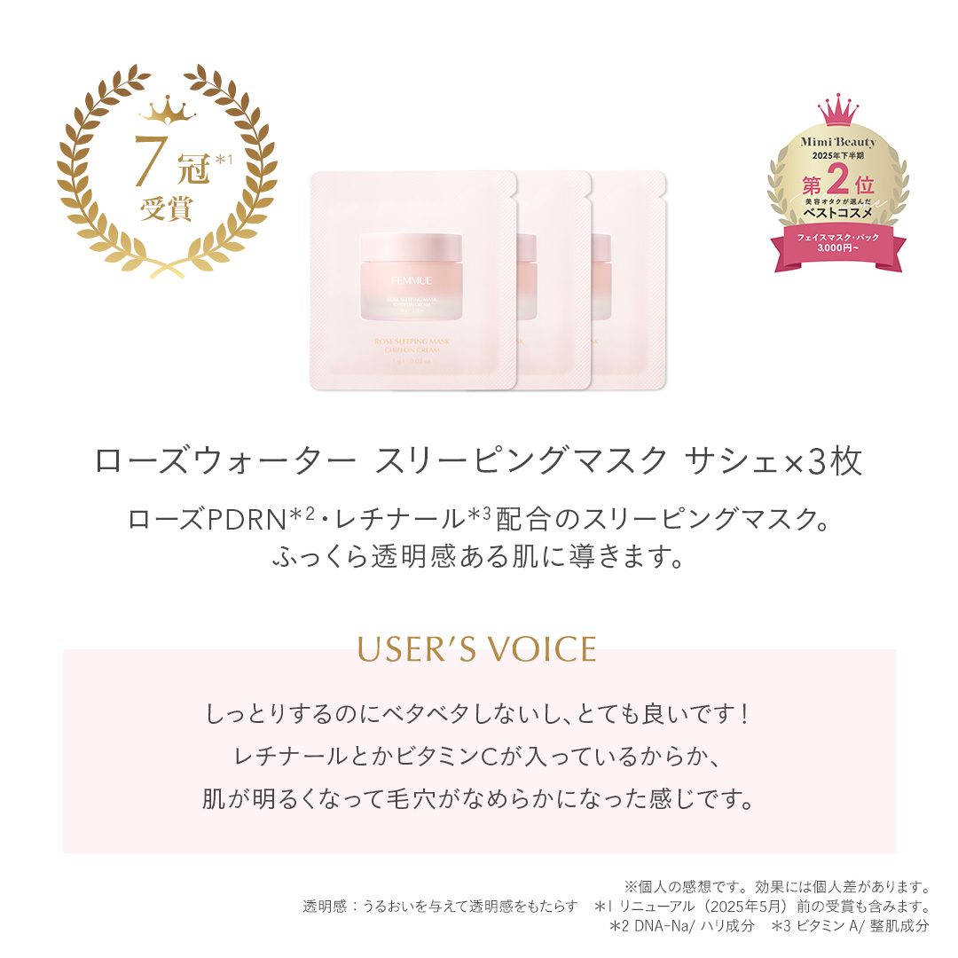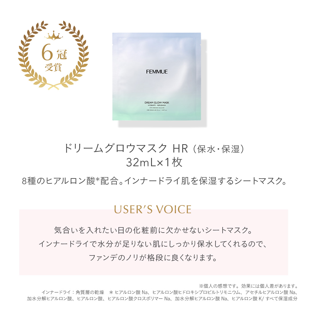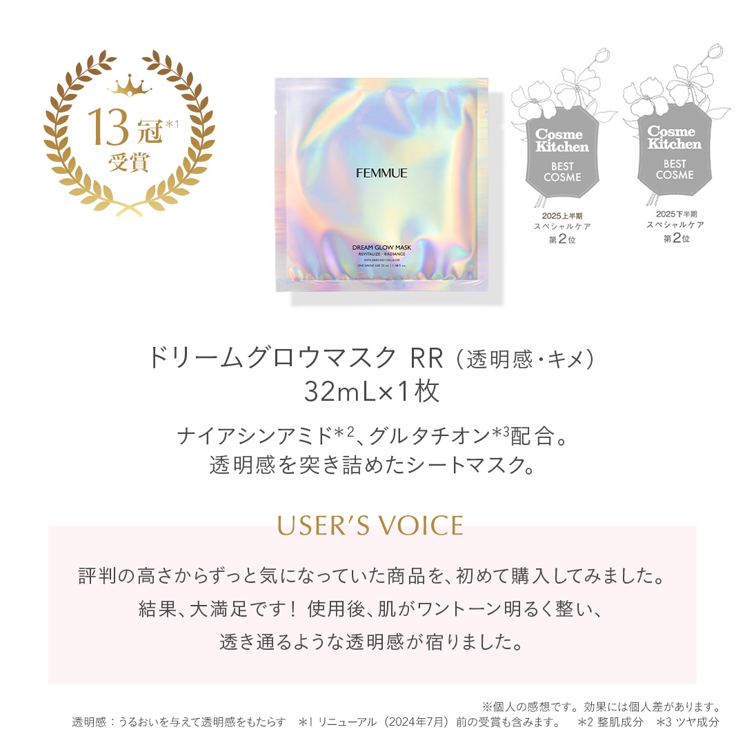 ITEM.4 ドリームグロウマスク RR(透明感・キメ)32mL×1枚 紫外線や乾燥によるくすみ肌をケアする、透明感を突き詰めた人気No.1のシートマスク。 POINT ナイアシンアミド*1とカメリアオイル*2のコンビネーションに、グルタチオン*1や、すこやかな肌をサポートするビタミンコンプレックス*3、肌のキメを整えるエーデルワイスカルス培養エキス*1を配合。ハリとツヤを与えながら、澄んだうるおいの映える肌へと導きます。ほのかなネロリの香り。 ご使用方法 [STEP1]マスクを袋から出して広げ、両面の保護シートをはがします。(裏表はありません) [STEP2]マスクを目の位置から合わせ、空気が入らないように貼っていきます。ヨレなどを調整し、顔に密着させます。 [STEP3]10~15分後にマスクをはがし、肌の上に残った液をなじませます。その後、美容液等でお手入れをしてください。 ※両面の保護シートは必ずはがしてお使いください。 透明感:うるおいを与えて透明感をもたらす 人気No.1:FEMMUE公式オンラインストア シートマスク部門売上/集計期間:2021年1月1日〜2025年12月31日 *1 整肌成分 *2 ツバキ種子油 /保湿成分 *3 パントテン酸Ca、アスコルビルリン酸Na、酢酸トコフェロール、ピリドキシンHCl /すべて整肌・保湿成分