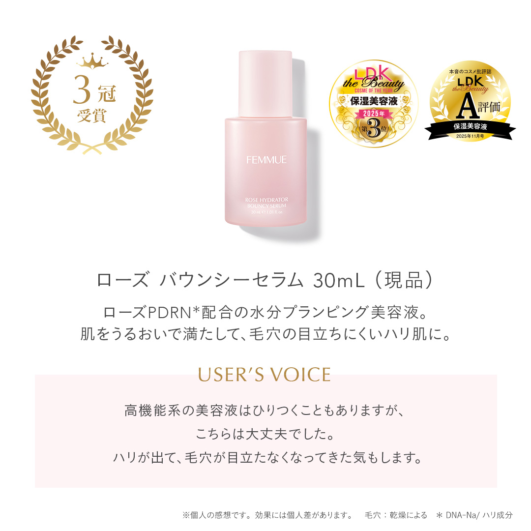 ITEM.1 ローズ バウンシーセラム30mL(現品) 弾むようなハリとうるおいをもたらす水分プランピング美容液。 POINT ダマスクローズウォーター*1をベースに、8種のヒアルロン酸*2、パンテノール*3が角質層まで浸透。レチナール*4がハリ・ ツヤを与え、うるおいのヴェールで肌を集中保湿し、乾燥などの外的ストレスからもしっかりとガード。肌にすっとなじみ、べたつきのない密着感と、内側*5からにじむようなツヤをもたらします。甘く優雅なダマスクローズ*6の香り。 ご使用方法 朝晩の洗顔後、化粧水で整えた清潔な肌に2~3プッシュをなじませてください。 *1 ダマスクバラ花水/保湿成分 *2 ヒアルロン酸Na、ヒアルロン酸クロスポリマーNa、加水分解ヒアルロン酸、ヒアルロン酸ヒドロキシプロピルトリモニウム、ヒアルロン酸、アセチルヒアルロン酸Na(すべて保湿成分)/ヒアルロン酸Naは分子サイズが異なる3種を配合 *3 整肌成分 *4 ハリ・ツヤ成分 *5 角質層まで *6 ダマスクバラ花油