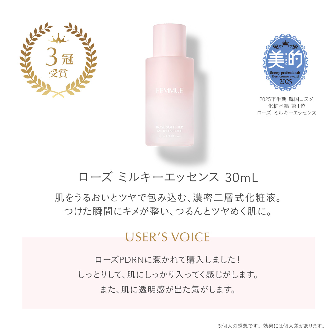 ITEM.2 ローズ ミルキーエッセンストラベルサイズ 30mL 肌をうるおいとツヤで包み込む、濃密二層式化粧液。 POINT つけた瞬間にキメが整い、ふっくらとしたやわらかさと、濡れたようなツヤが宿る肌へ。ローズPDRN*1、8種のヒアルロン酸*2、レチナール*3、ナイアシンアミド*4など先進の美容成分を贅沢に配合。ダマスクローズウォーター*5と植物由来のクリーム層が瞬時に溶け合い、肌を包み込みます。乾燥やゆらぎやすい肌、毛穴目立ち*6などのサインに多角的にアプローチし、使うたびに肌印象が変わる二層式化粧液。甘く優雅なダマスクローズ*7の香り。 ご使用方法 洗顔後、使用前によく振ってから適量を手にとり、顔全体にやさしくなじませます。化粧水としてお使いいただけます。 *1 DNA-Na/ハリ成分 *2 ヒアルロン酸Na、ヒアルロン酸クロスポリマーNa、加水分解ヒアルロン酸、ヒアルロン酸ヒドロキシプロピルトリモニウム、ヒアルロン酸、アセチルヒアルロン酸Na(すべて保湿成分)/ヒアルロン酸Naは分子サイズが異なる3種を配合 *3 ハリ・ツヤ成分 *4 整肌成分 *5 ダマスクバラ花水/保湿成分 *6 乾燥による *7 ダマスクバラ花油