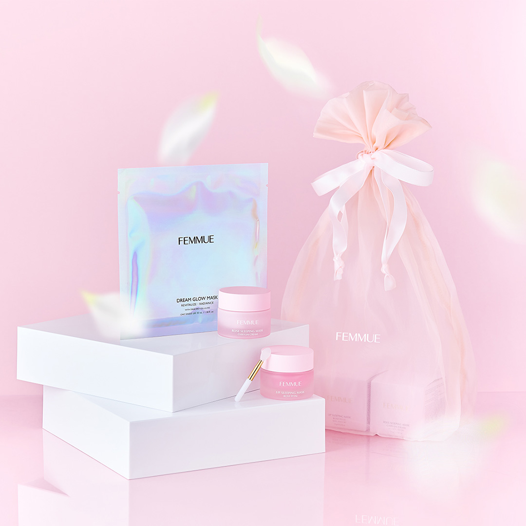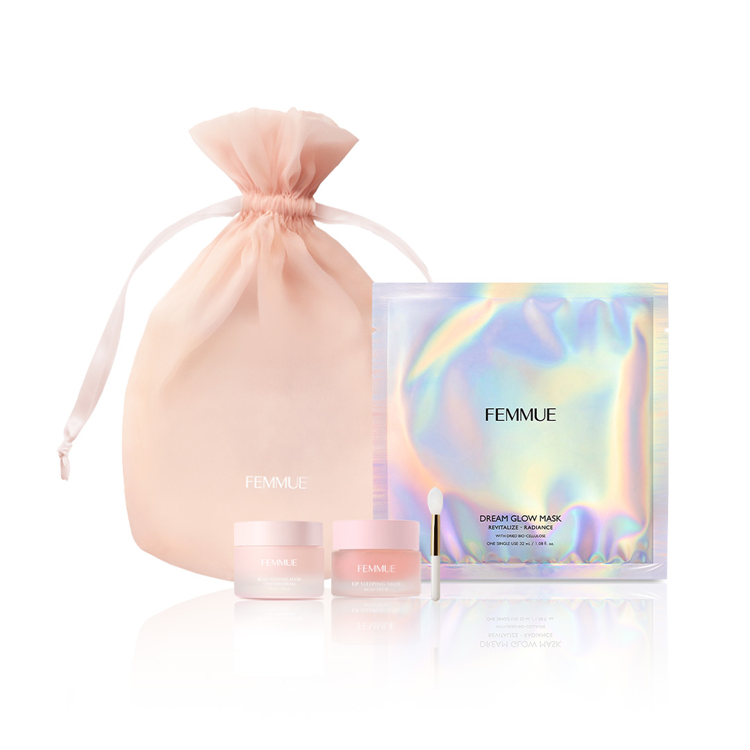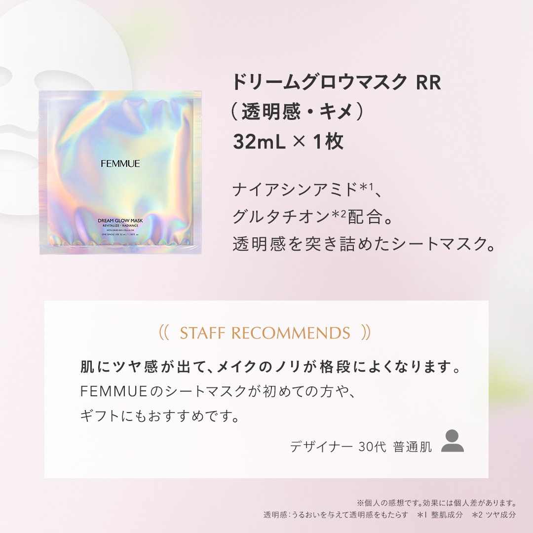 ITEM.3 ドリームグロウマスク RR(透明感・キメ)32mL×1枚 紫外線や乾燥によるくすみ肌をケアする、透明感を突き詰めた人気No.1のシートマスク。 POINT ナイアシンアミド*1とカメリアオイル*2のコンビネーションに、グルタチオン*1や、すこやかな肌をサポートするビタミンコンプレックス*3、肌のキメを整えるエーデルワイスカルス培養エキス*1を配合。ハリとツヤを与えながら、澄んだうるおいの映える肌へと導きます。ほのかなネロリの香り。 ご使用方法 [STEP1]マスクを袋から出して広げ、両面の保護シートをはがします。(裏表はありません) [STEP2]マスクを目の位置から合わせ、空気が入らないように貼っていきます。ヨレなどを調整し、顔に密着させます。 [STEP3]10~15分後にマスクをはがし、肌の上に残った液をなじませます。その後、美容液等でお手入れをしてください。 ※両面の保護シートは必ずはがしてお使いください。 透明感:うるおいを与えて透明感をもたらす 人気No.1:FEMMUE公式オンラインストア シートマスク部門売上/集計期間:2021年1月1日〜2025年12月31日 *1 整肌成分 *2 ツバキ種子油 /保湿成分 *3 パントテン酸Ca、アスコルビルリン酸Na、酢酸トコフェロール、ピリドキシンHCl /すべて整肌・保湿成分