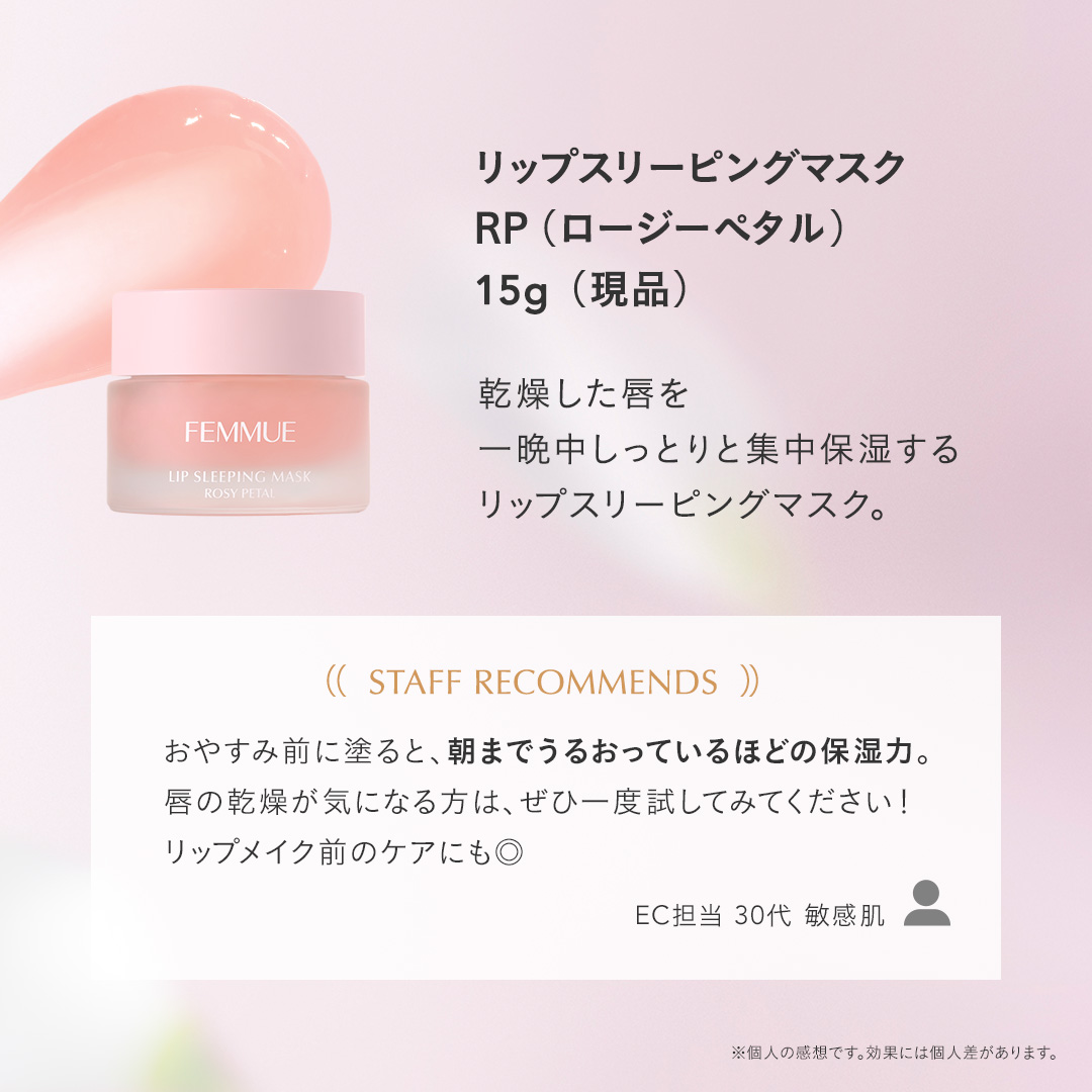 ITEM.2 リップスリーピングマスク RP(ロージーペタル) 15g(現品) 乾燥した唇を一晩中集中ケアするリップスリーピングマスク。 POINT べたつきを感じにくいなめらかなテクスチャーで、就寝中しっとり集中保湿し、翌朝にはいきいきとした唇へ。サンフラワーオイル*1やスクワランなど、唇によくなじみ豊かなうるおいを補給する、植物由来の保湿成分を惜しみなく配合。夜だけでなく日中のリップケアにもお使いいただけます。ローズ*2とゼラニウム*3をベースにした華やかなフローラルノートの香り。 ご使用方法 唇の乾燥や荒れを防ぎたいときに。就寝前に唇に適量をなじませ、そのままお休みください。翌朝にはふっくら・しっとりとしたうるおいが唇に宿ります。日中のリップトリートメントにもお使いいただけます。 *1 ヒマワリ種子油 *2 ダマスクバラ花油 *3 マツリカ花油
