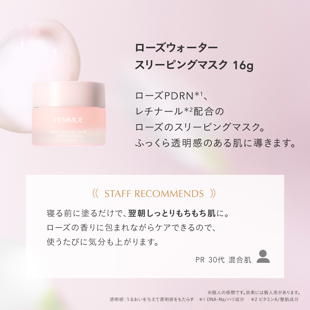 ITEM.1 ローズウォーター スリーピングマスク16g 翌朝の肌にふっくら透明感をもたらす、ローズの睡眠美容マスク。 POINT ダマスクローズウォーター*1を約80%配合。ローズPDRN*2やレチナール*3、ビタミンC*4などの美容成分が肌ストレス*5にアプローチして、ハリと透明感を与えます。ぷるんとみずみずしいテクスチャーで、べたつかずにすっきり。たっぷりと塗って一晩置くだけで、なめらかでみずみずしい肌へと整えます。夜だけでなく日中の保湿クリームとしてもお使いいただけます。やさしく自然なローズ*6の香り。 ご使用方法 夜、スキンケアの最後にパール3粒大を肌にのせ、よくなじませます。そのまま拭き取らずにお休みください。スキンケアの最後にクリームとして使用することもできます。パール1粒大でさっぱりとした使用感、2粒大でしっとりとした使用感に。 透明感:うるおいを与えて透明感をもたらす *1 ダマスクバラ花水/保湿成分 *2 DNA-Na/ハリ成分 *3 ビタミンA/整肌成分 *4 アスコルビン酸/整肌成分 *5 乾燥など *6 ダマスクバラ花油